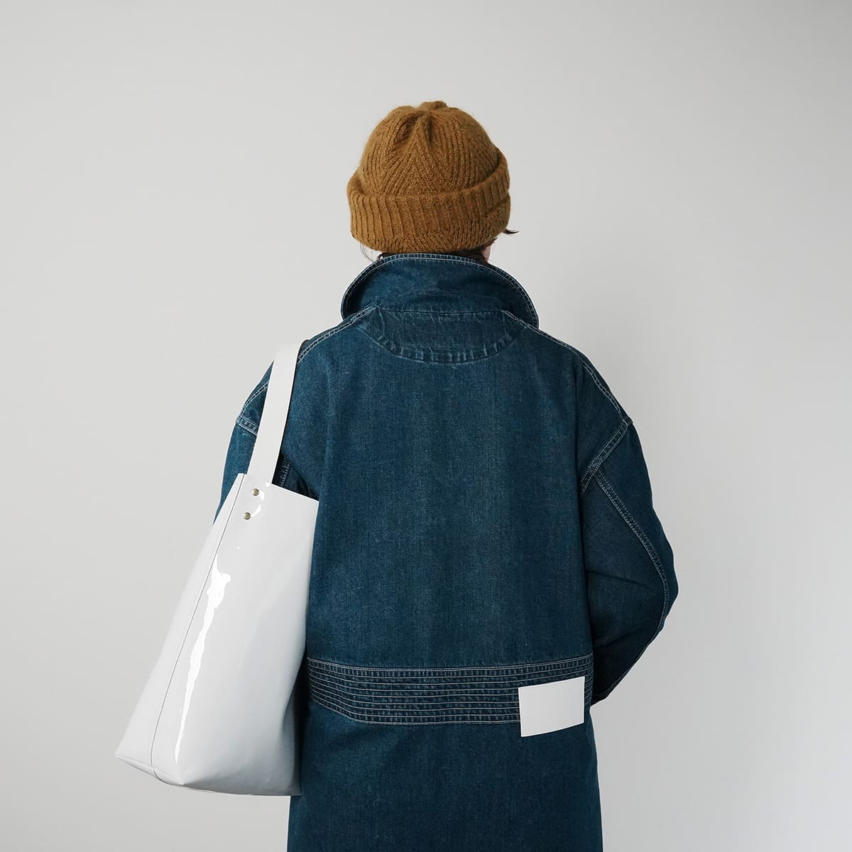 白のステッチと光沢感のあるバッグがぴったり。