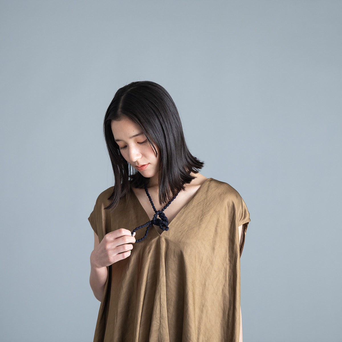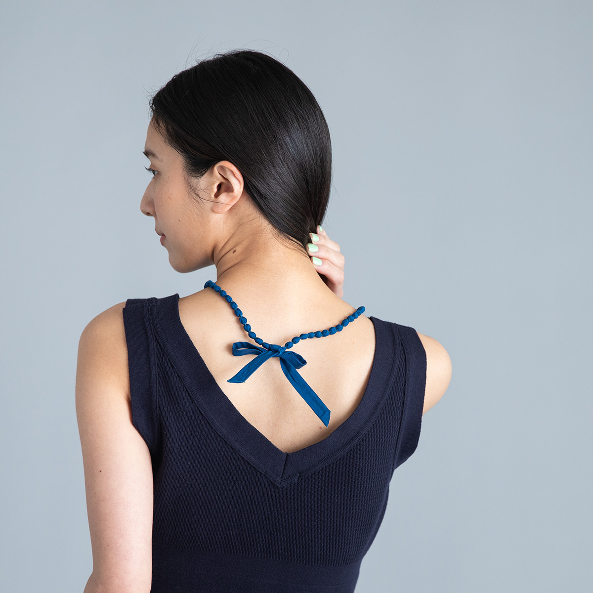 ブルーのネックレスは同色でまとめます。