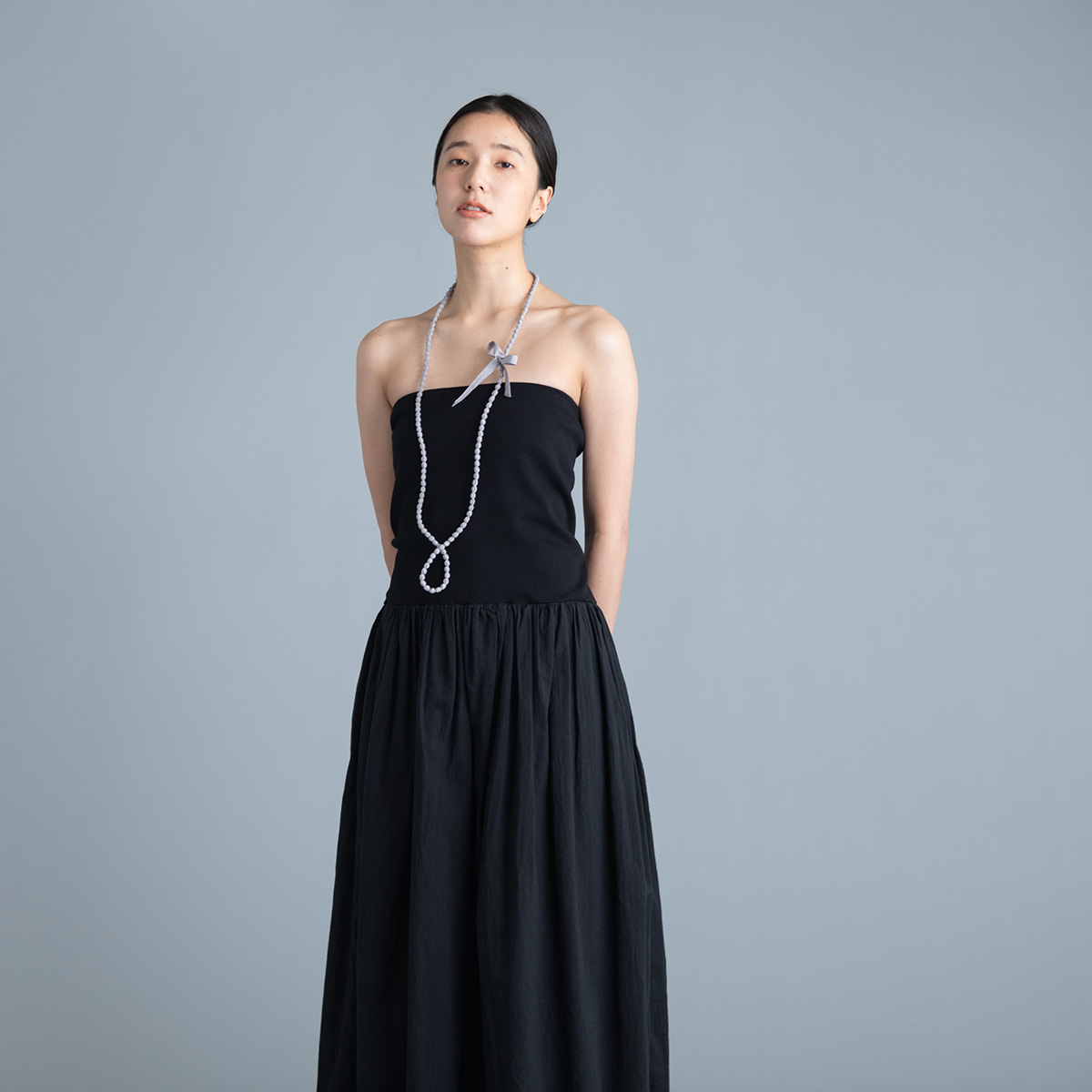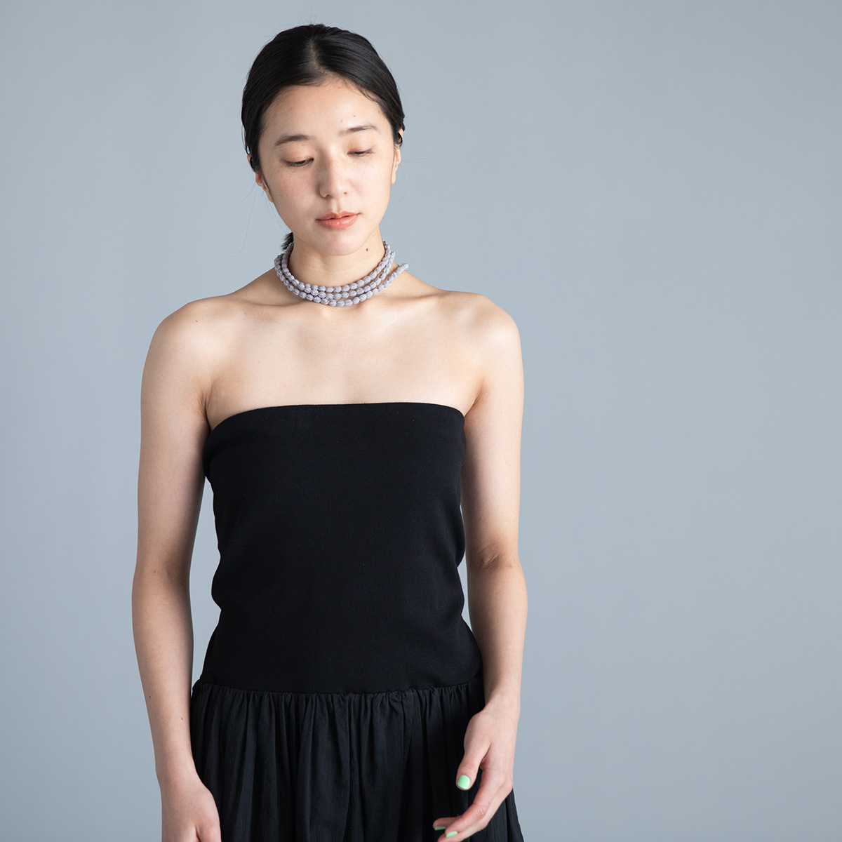 黒のチューブトップワンピースと合わせて大人っぽく。