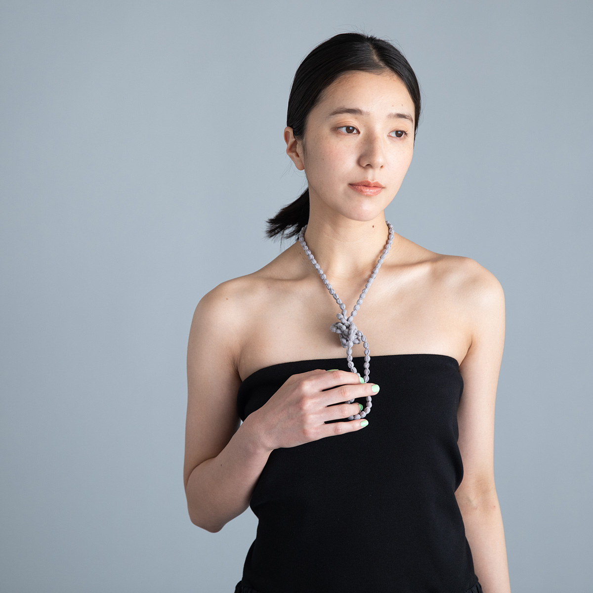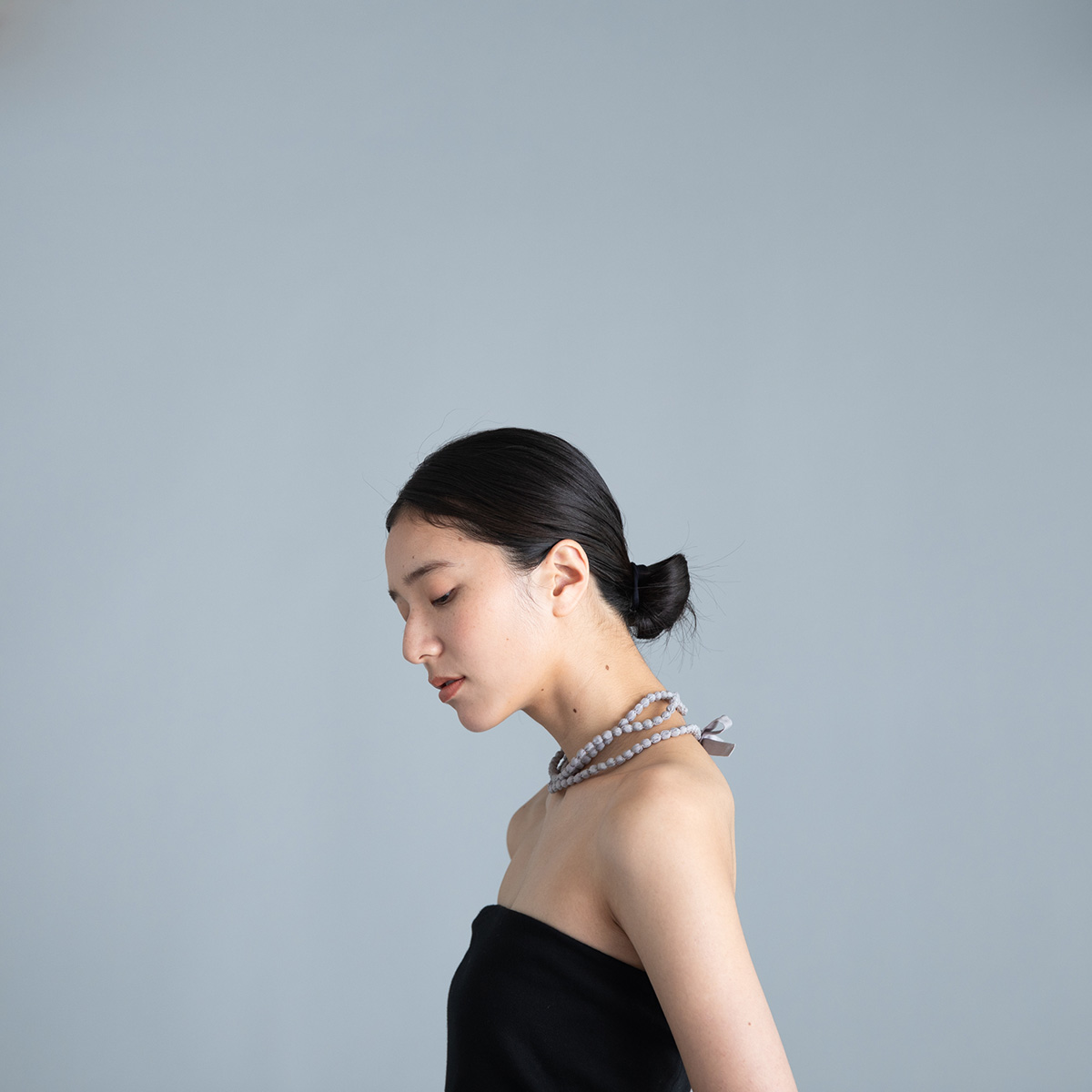ネックレスのリボンを主役にします。