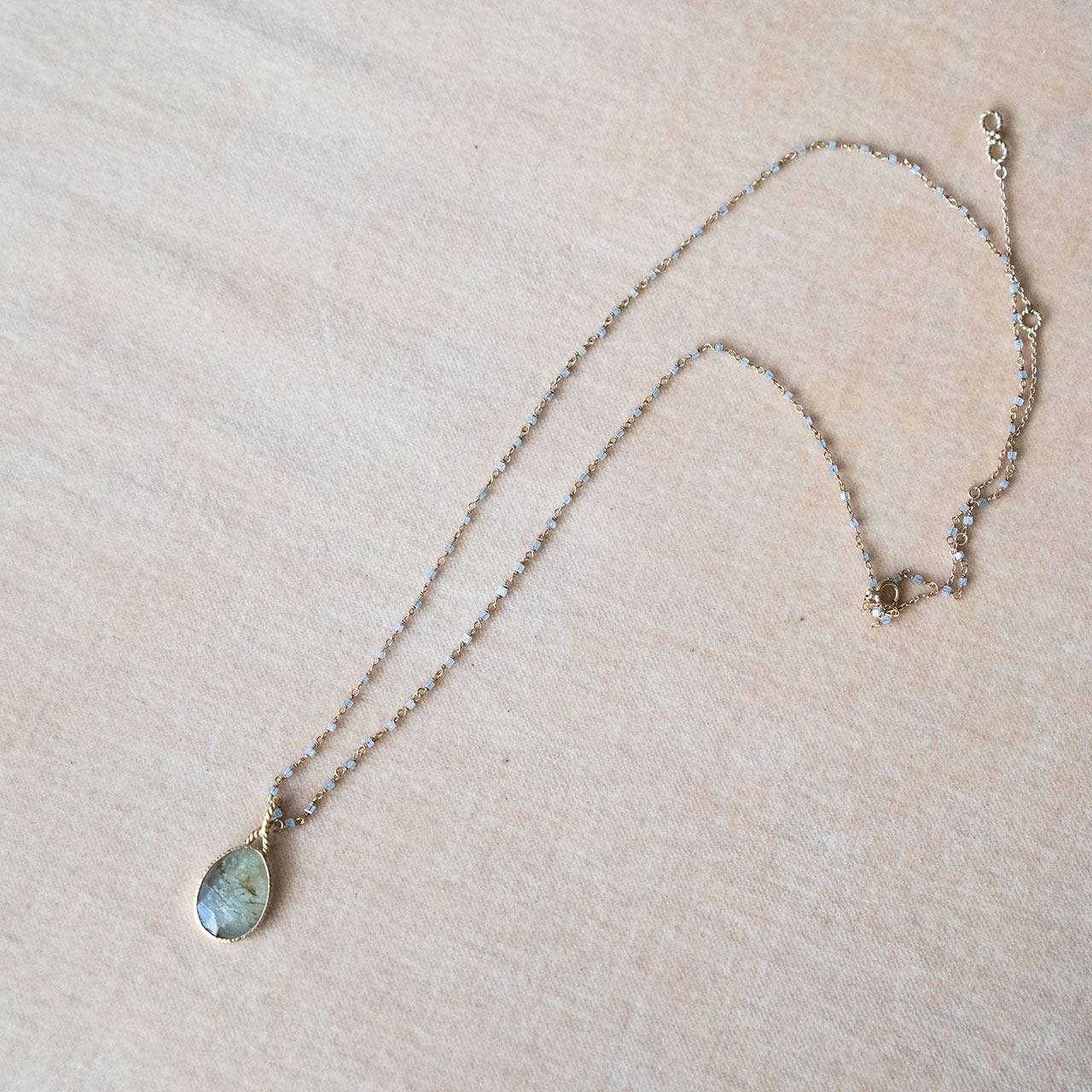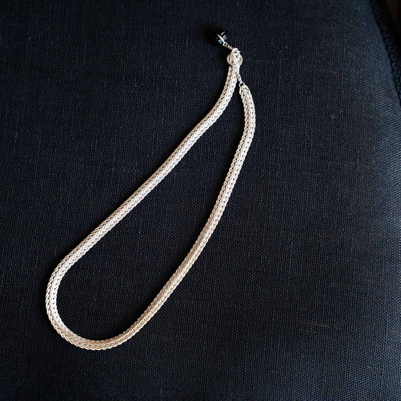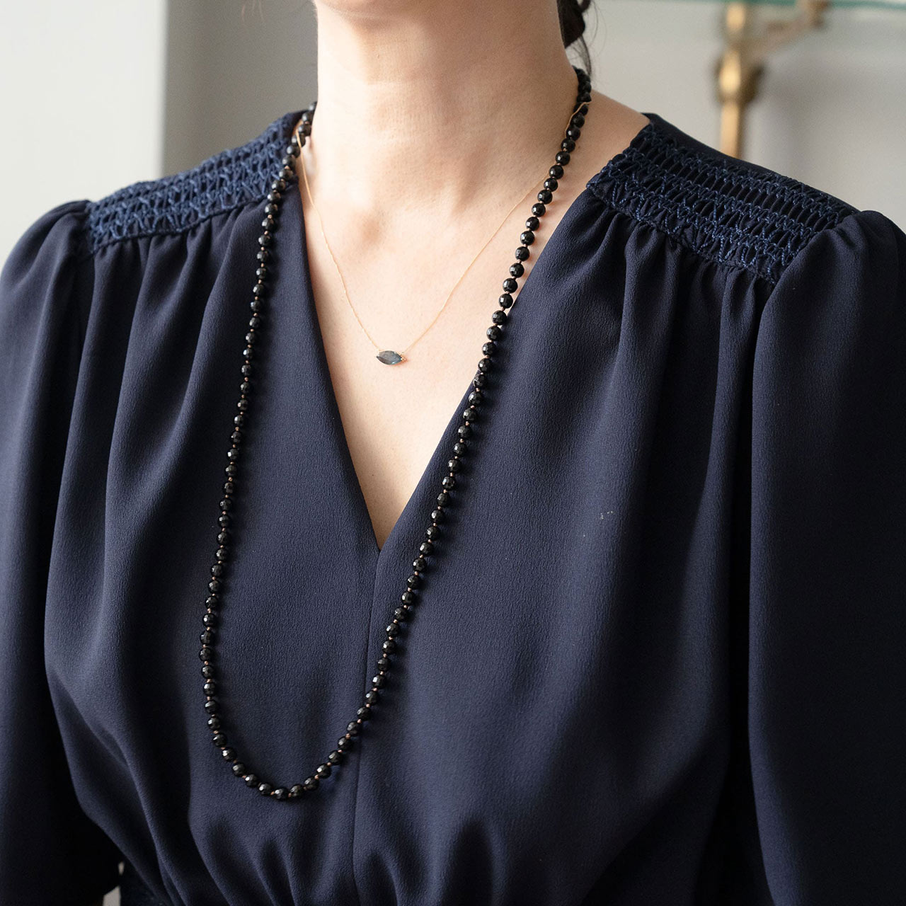 長めのネックレスは黒のオニキス。