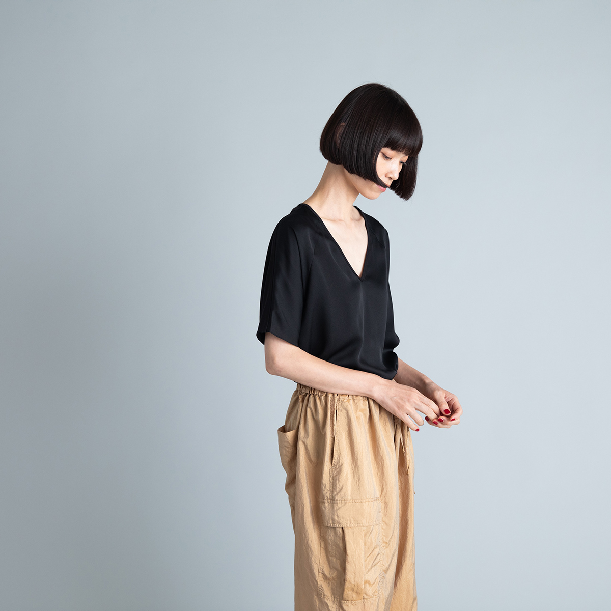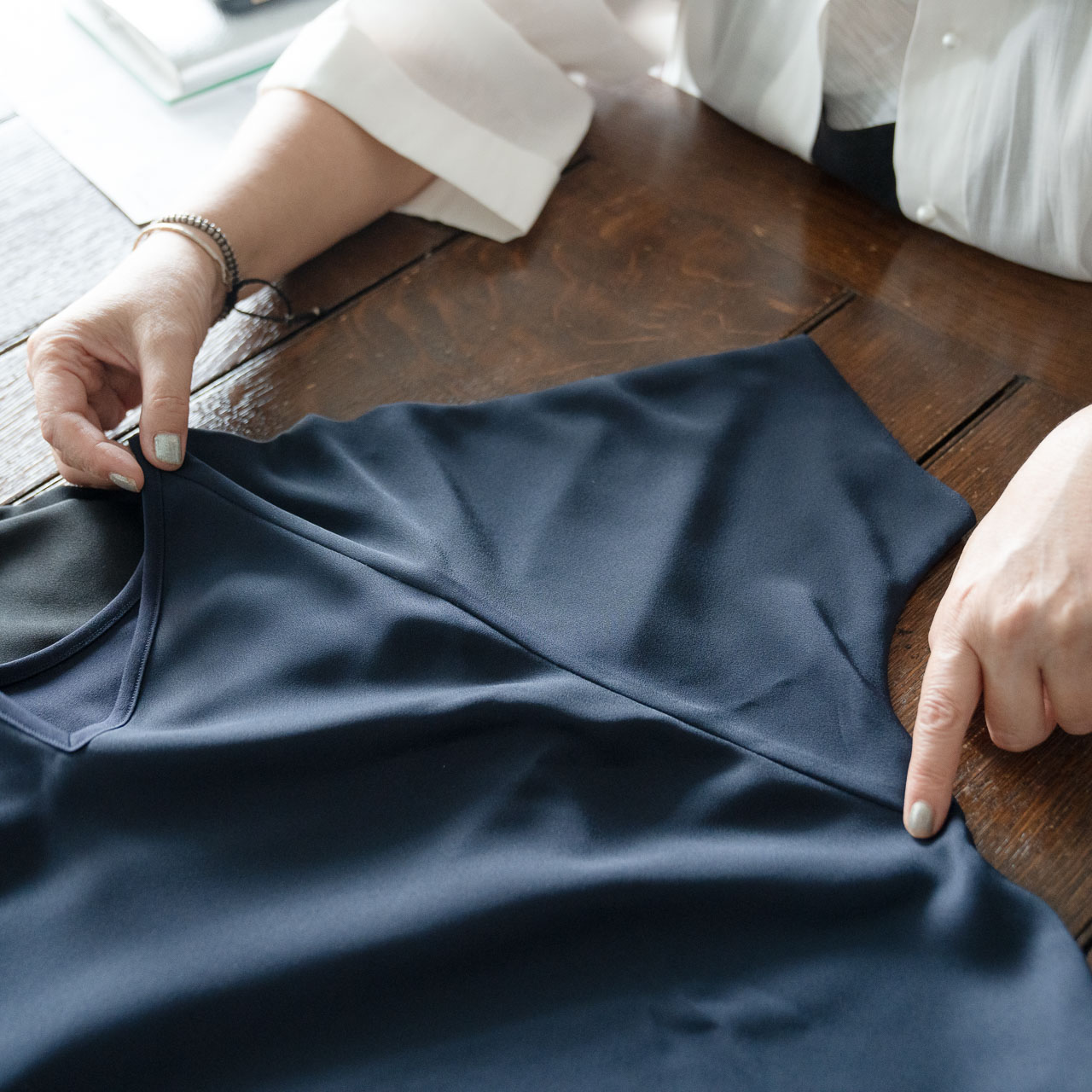 斜めに切り替え線を入れ、肩から袖をひと続きに