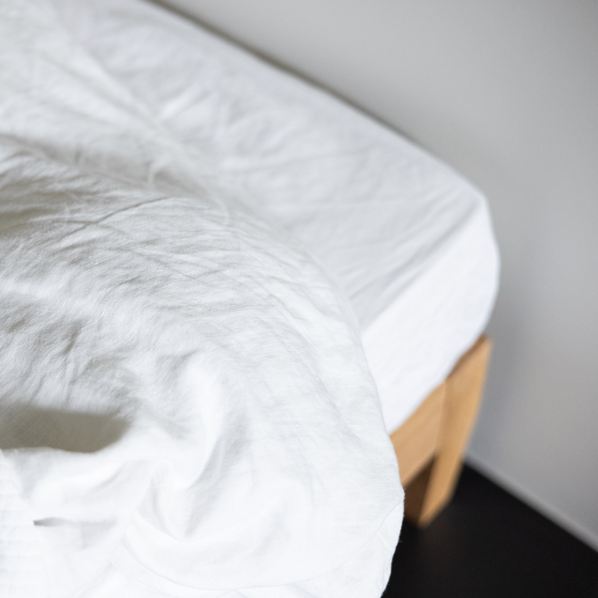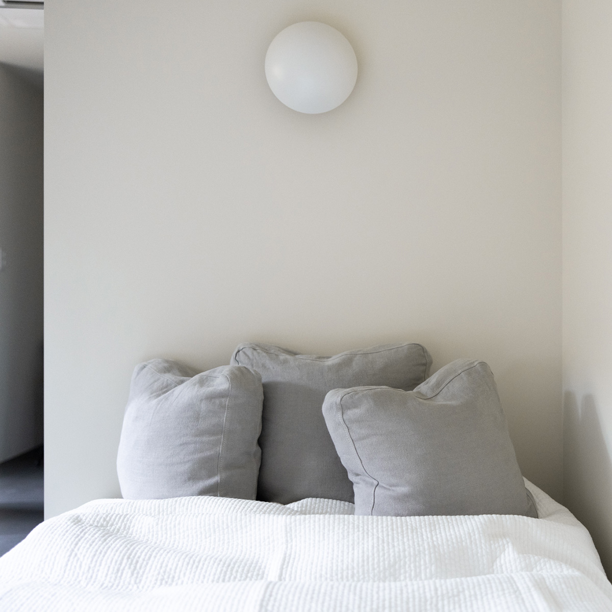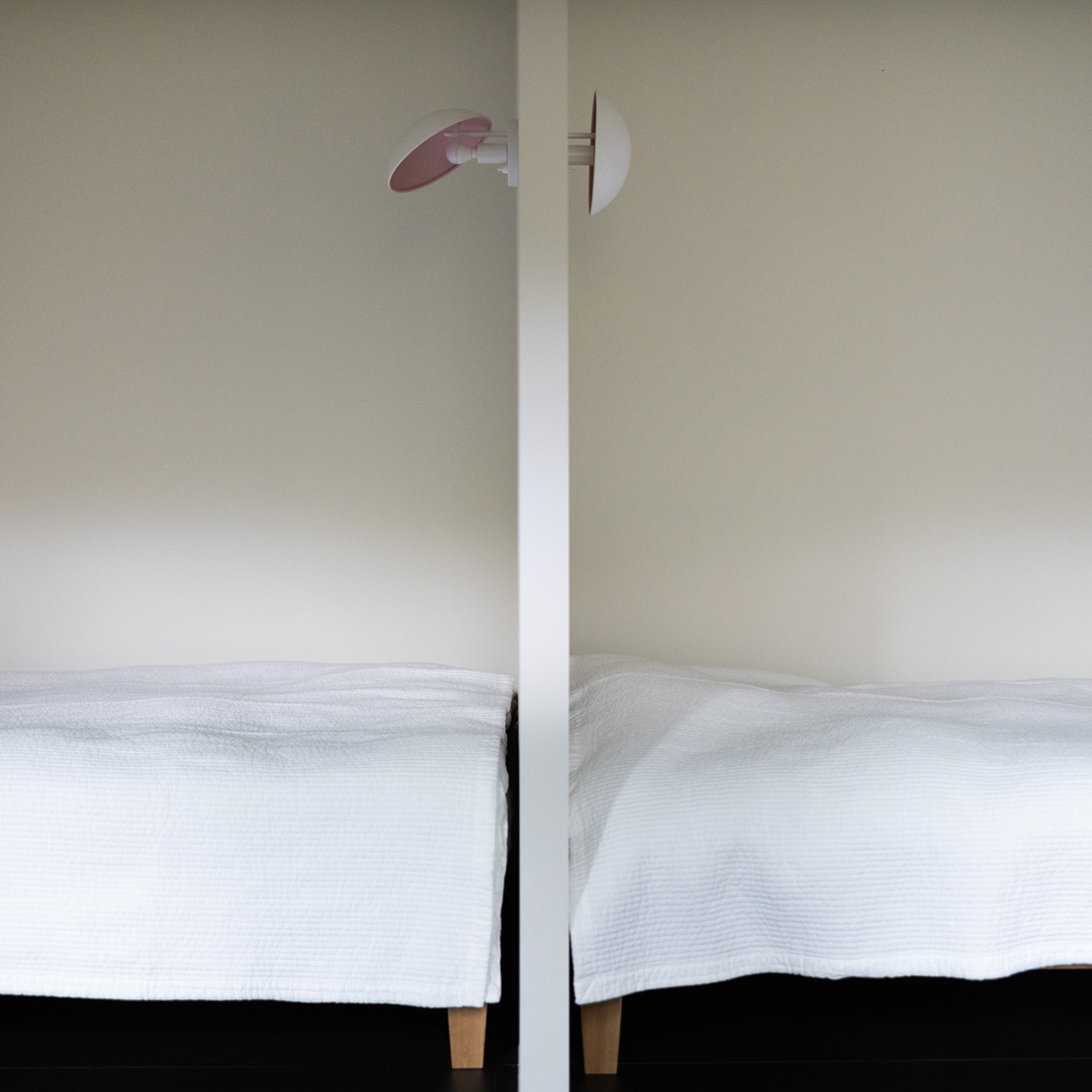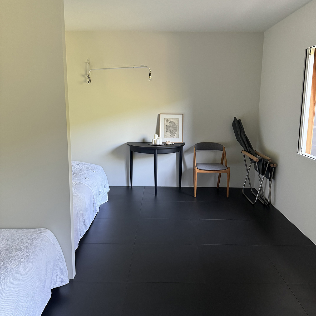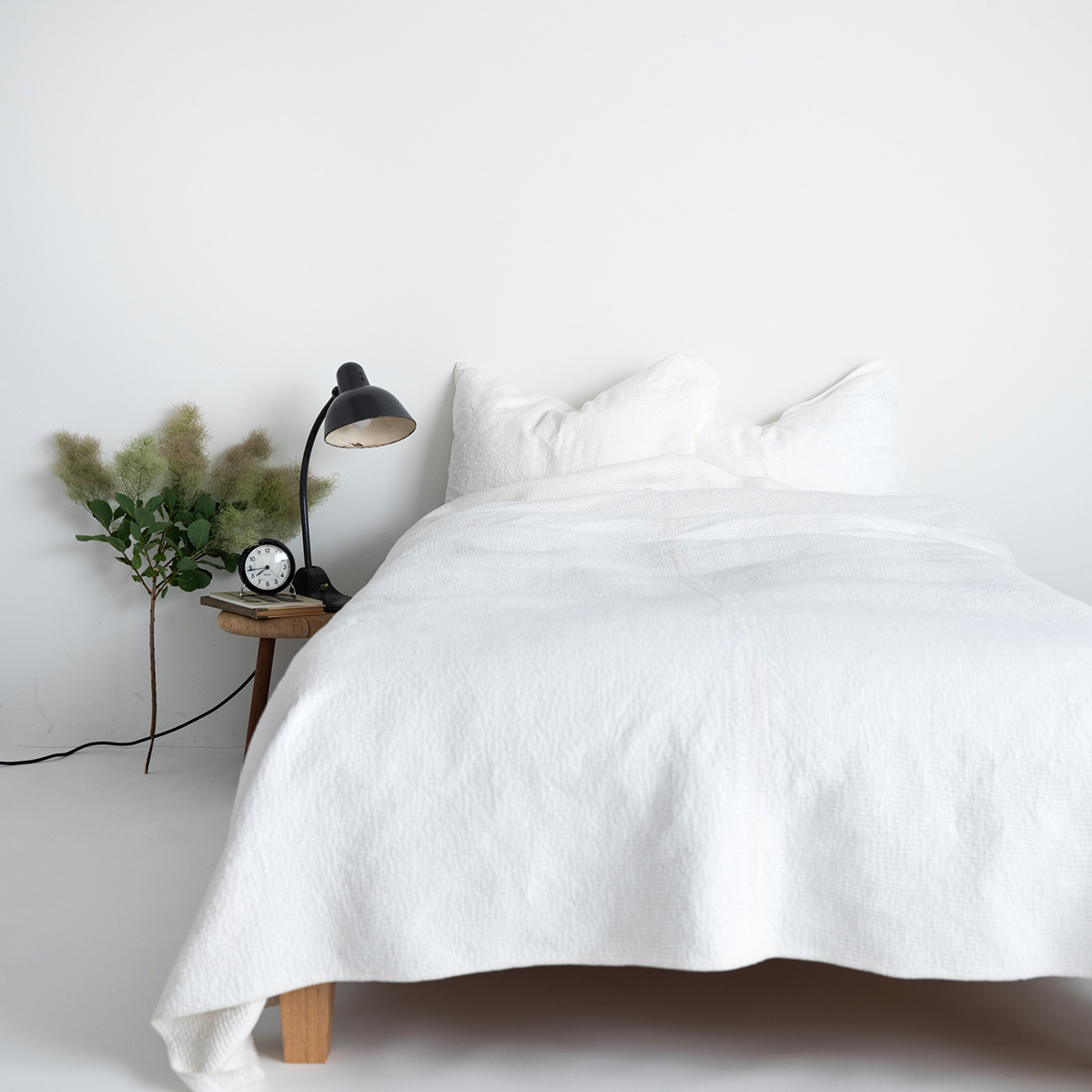 ベッド脇には、スツールやライトを置いて、