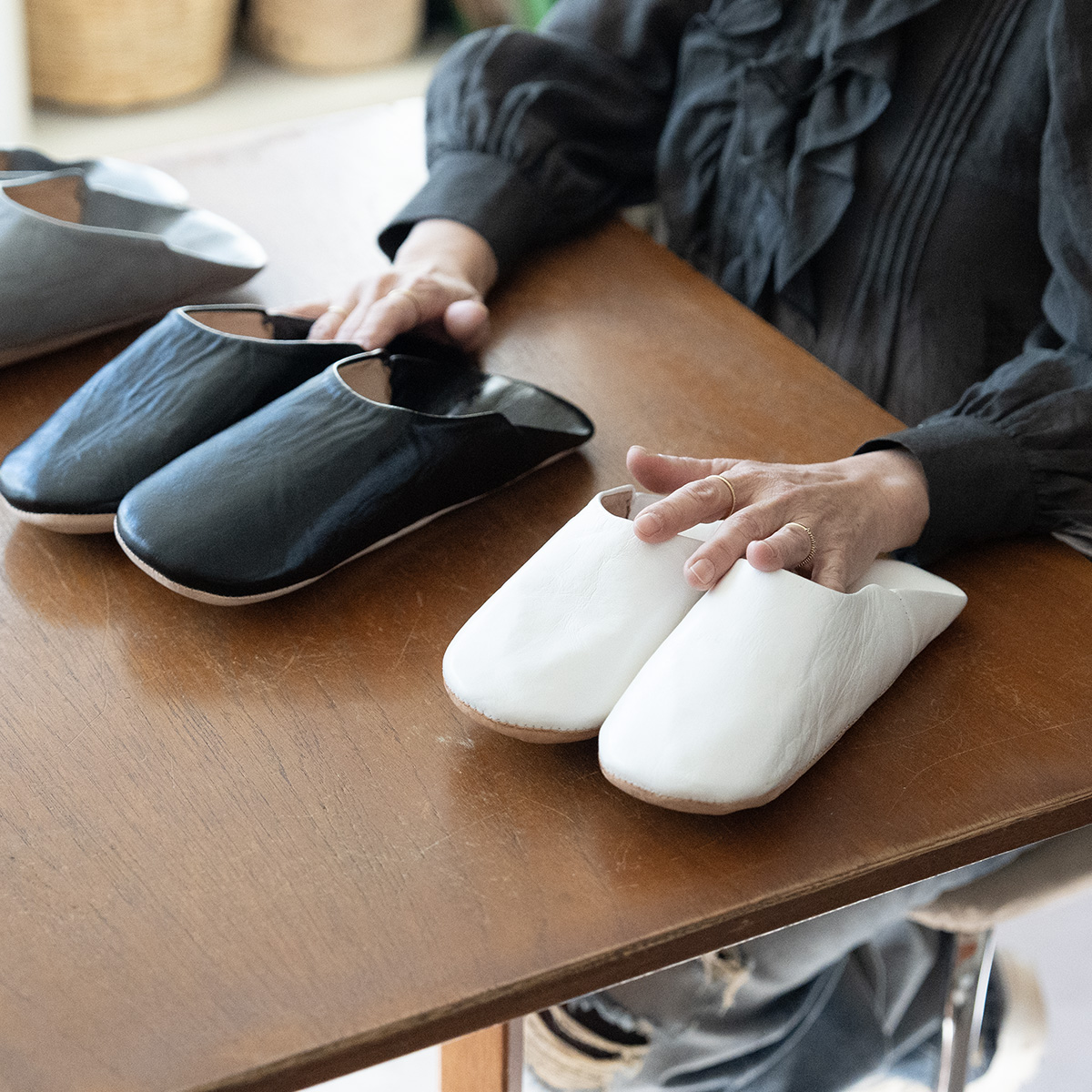 モロッコの革製ルームシューズ「バブーシュ」を、