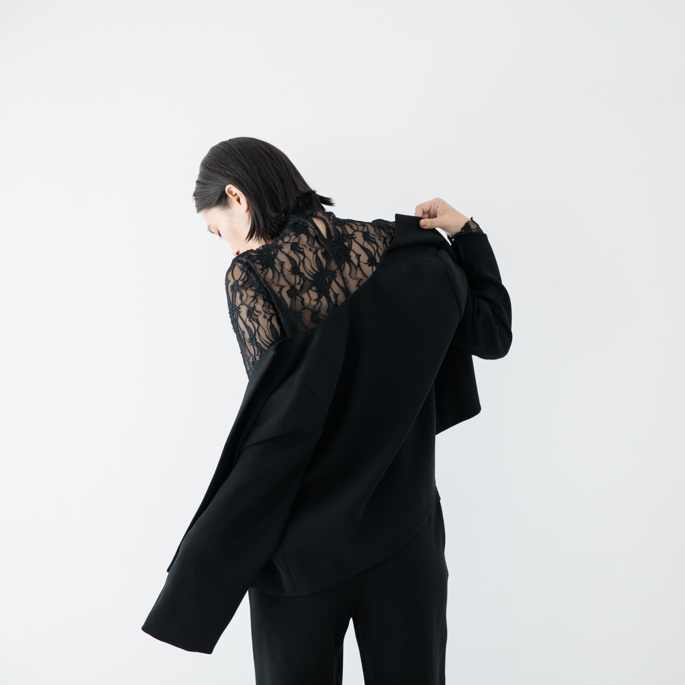 SAQUIのフォーマルジャケットとレースプルオーバー。