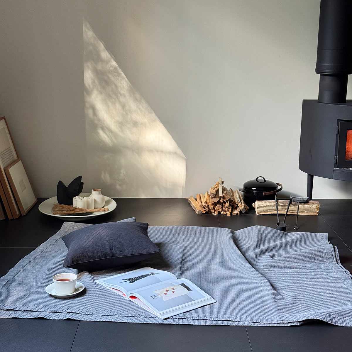 薪ストーブの前にイブルを敷いて、