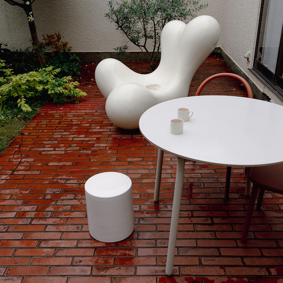 陶器製のスツールは濡れてもへっちゃら。