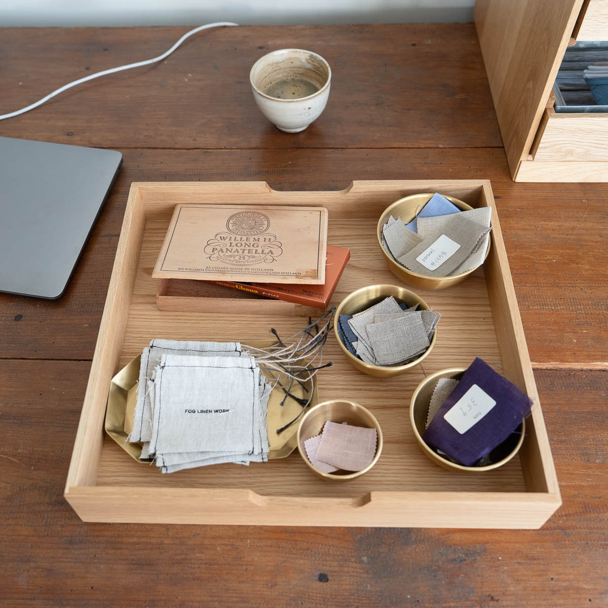 生地サンプルを入れた真鍮のボウルはfogのもの。