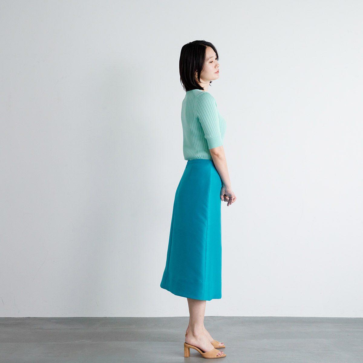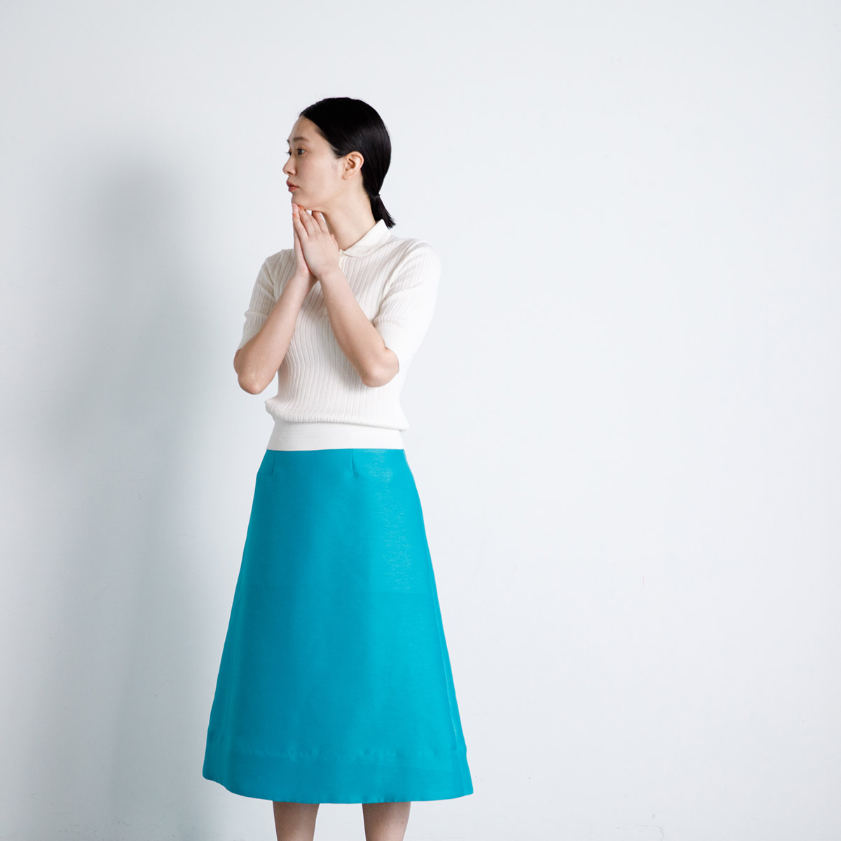 きれいなサックスブルーのスカートには、