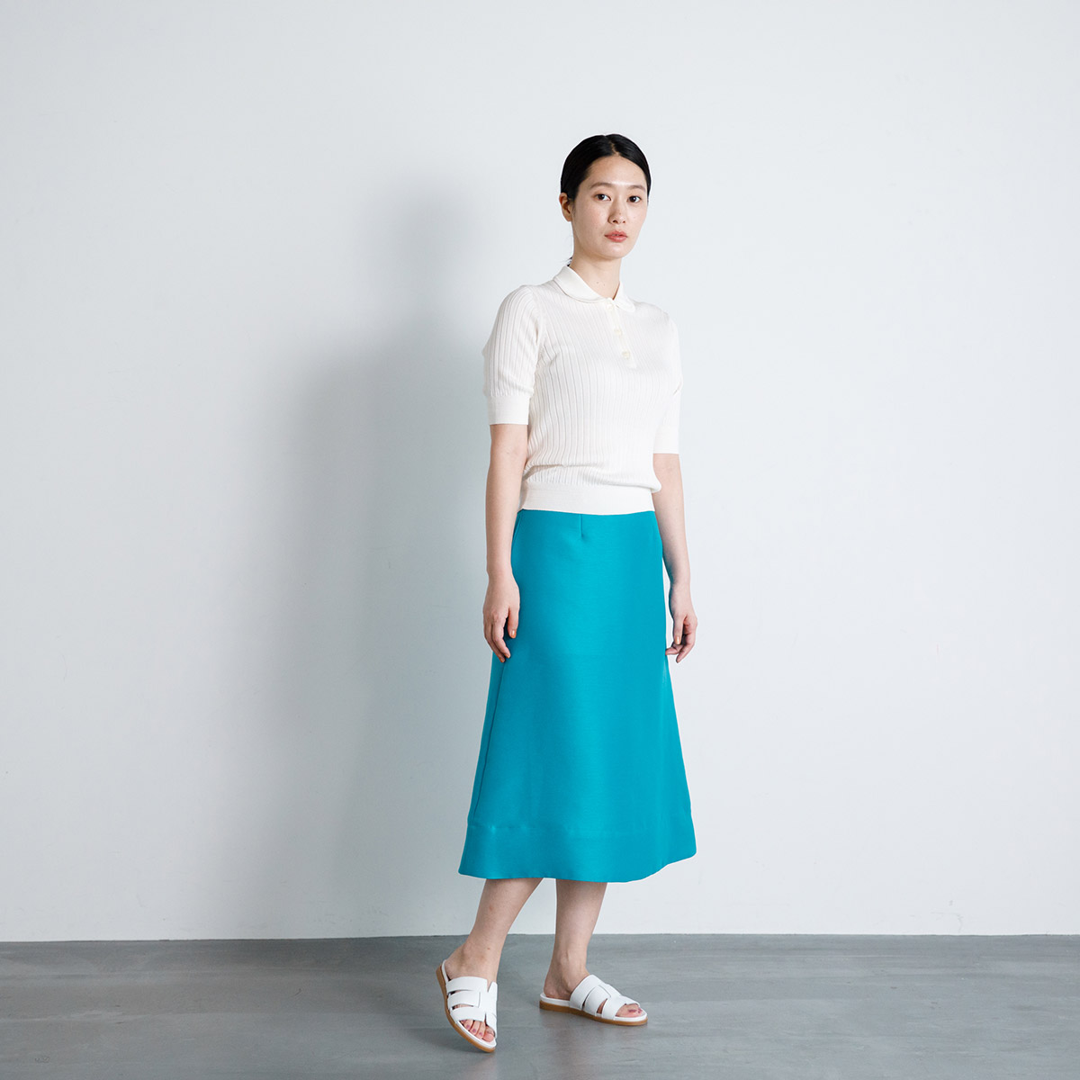 足元は白のサンダルを。
