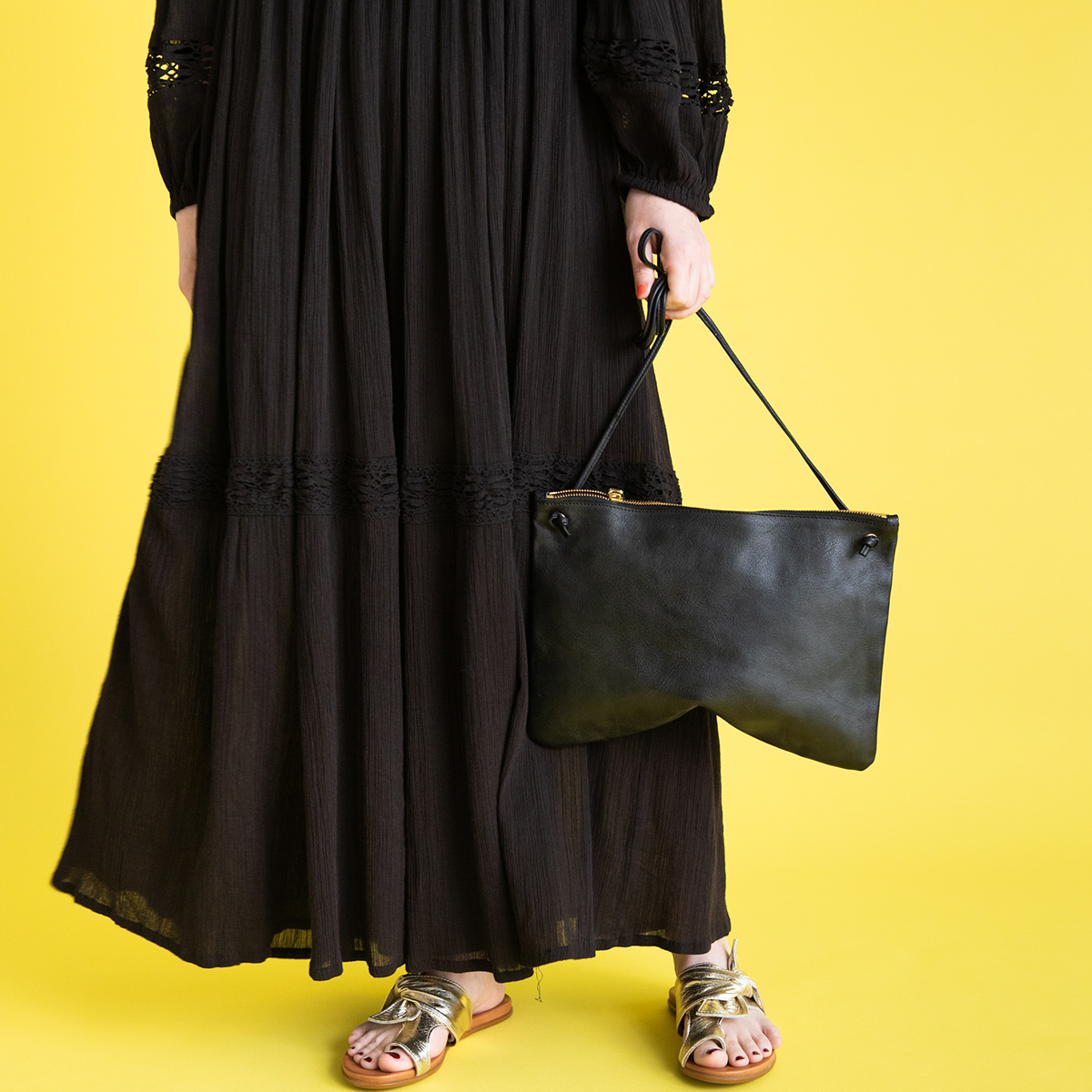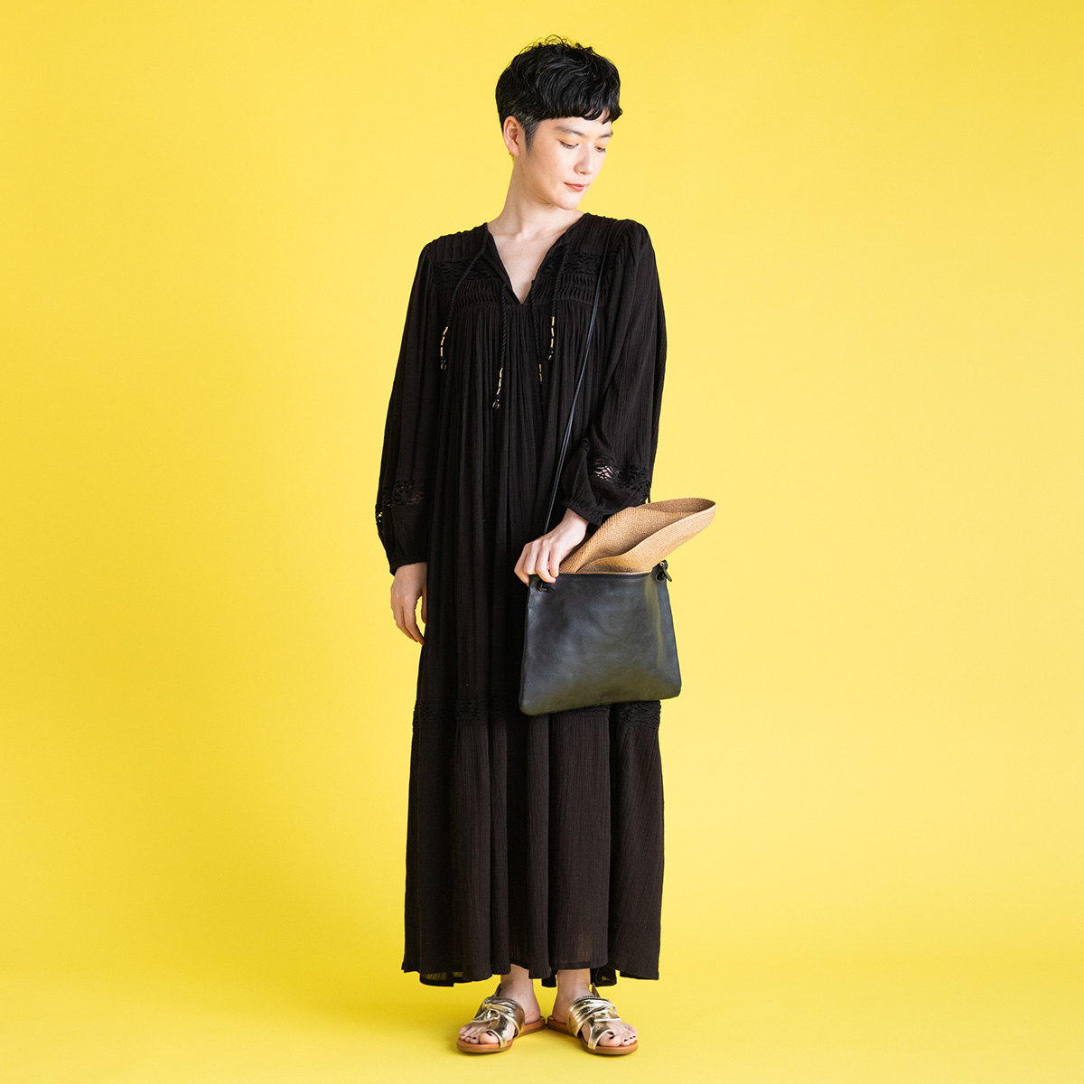 斜めがけしたり、またはヒモを結んで肩がけしたりと、