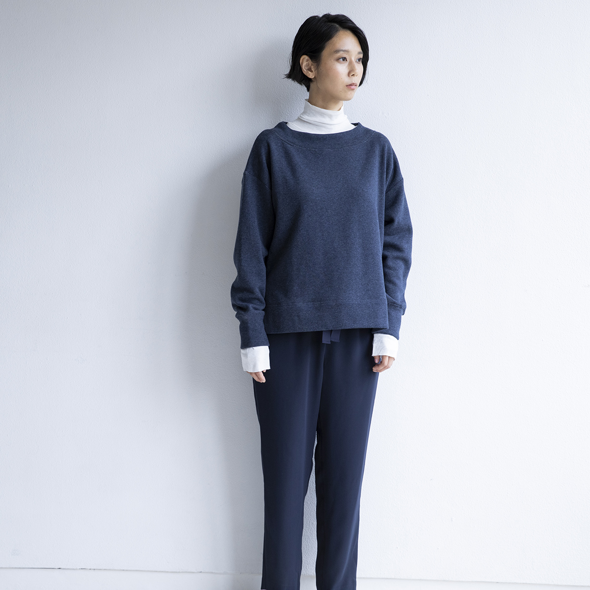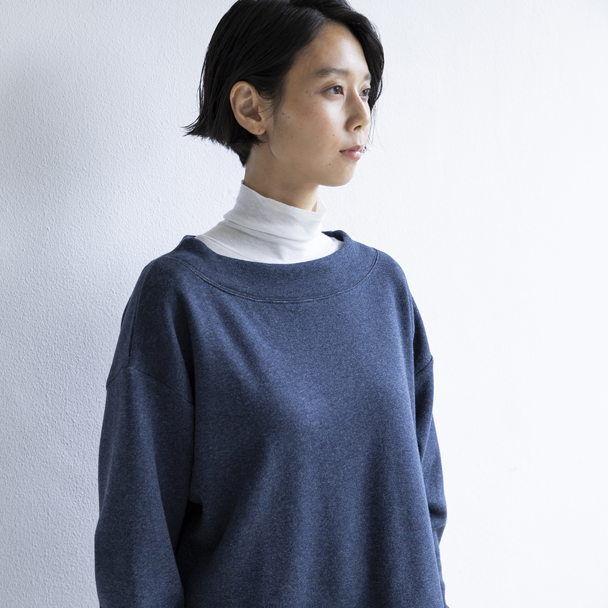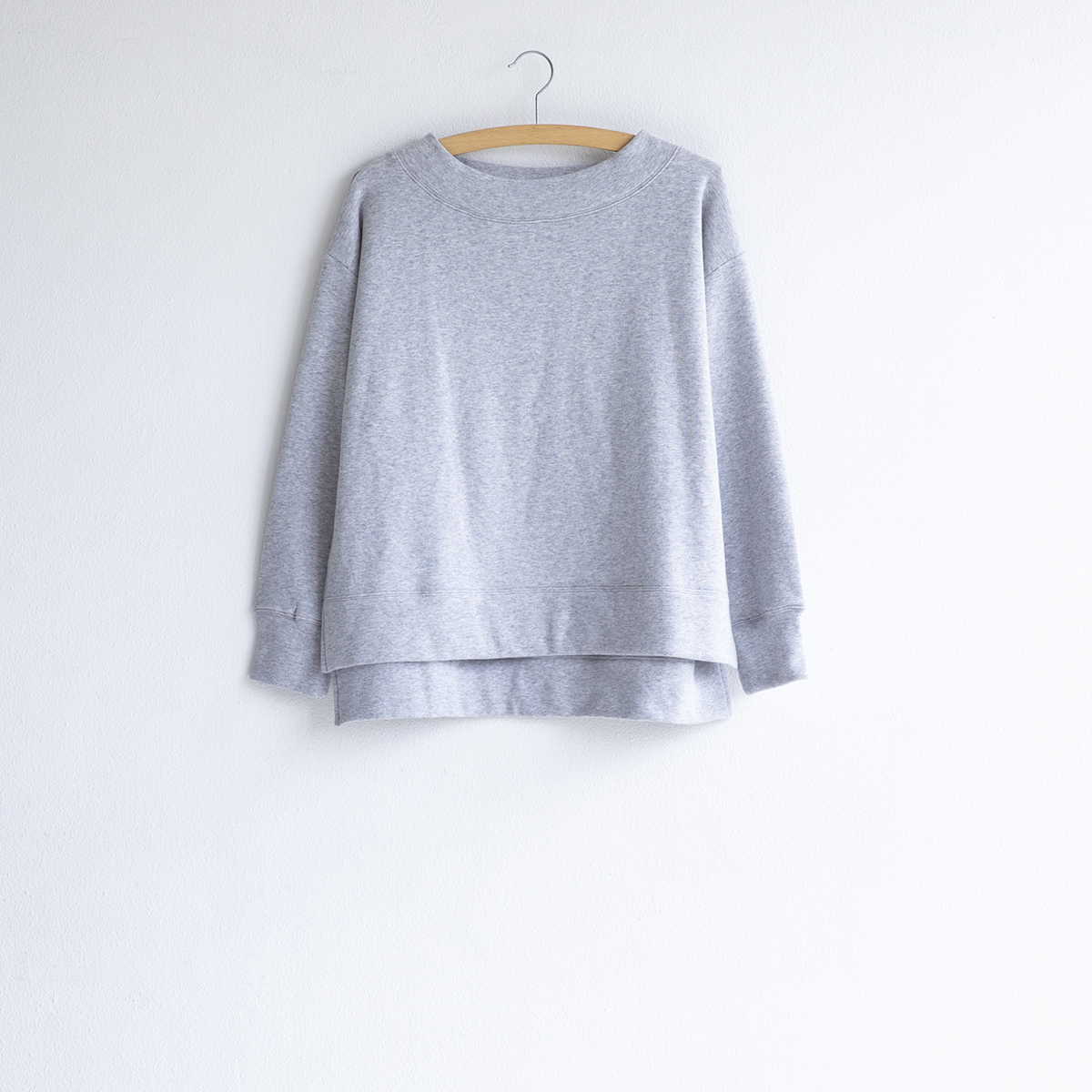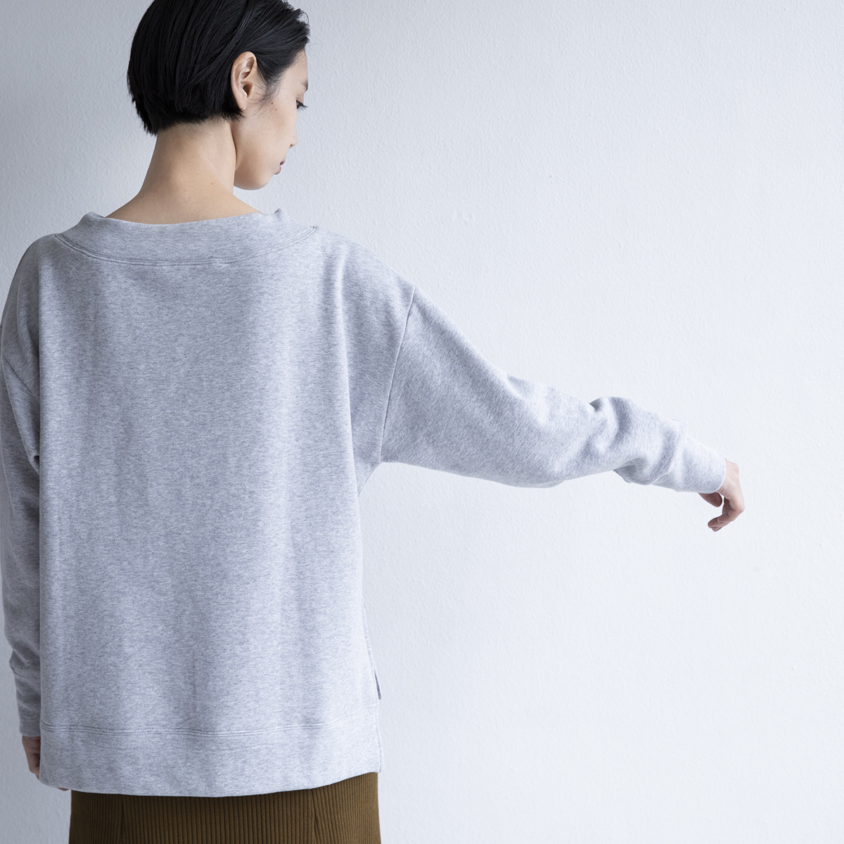 ボートネック風のやや広めなネックデザインです。