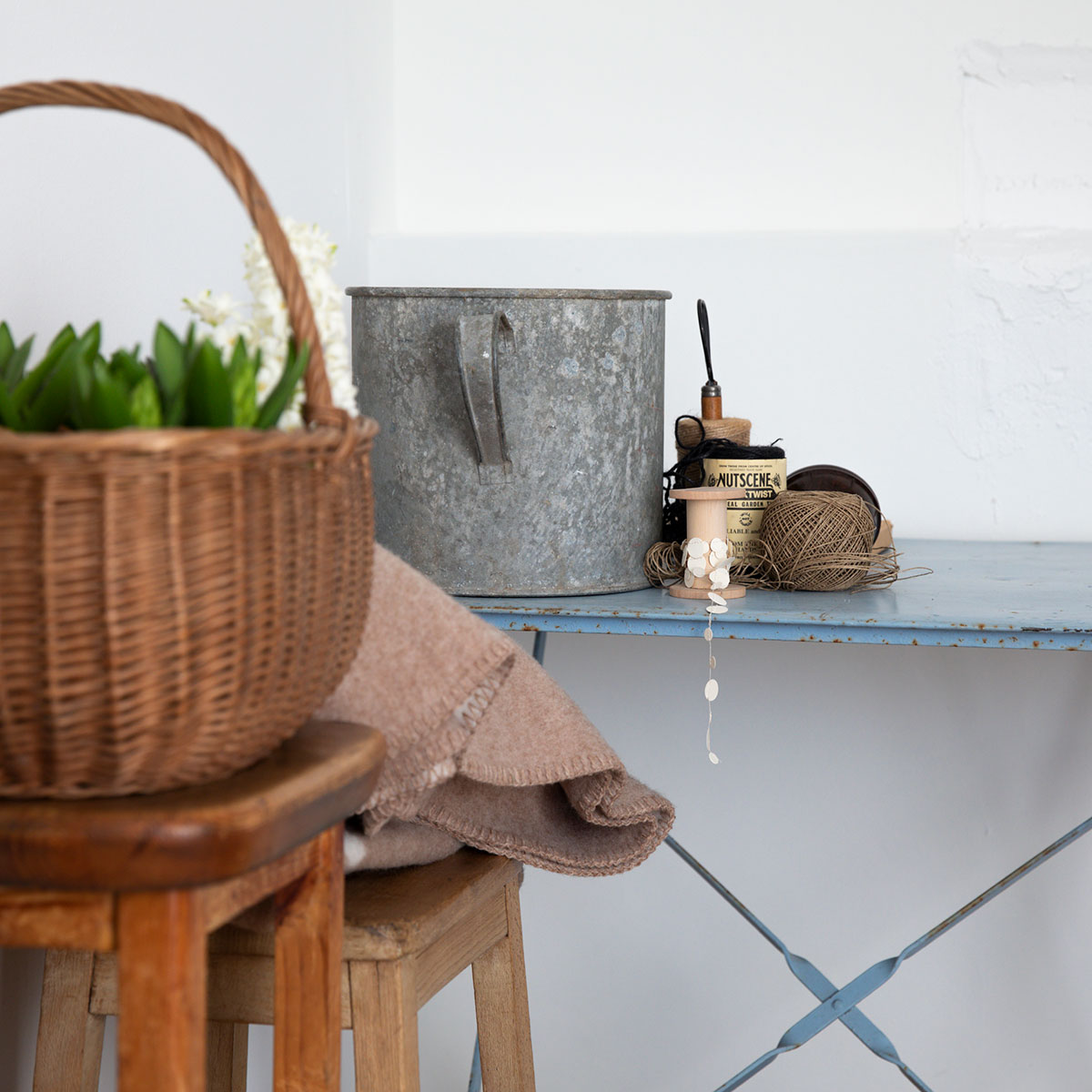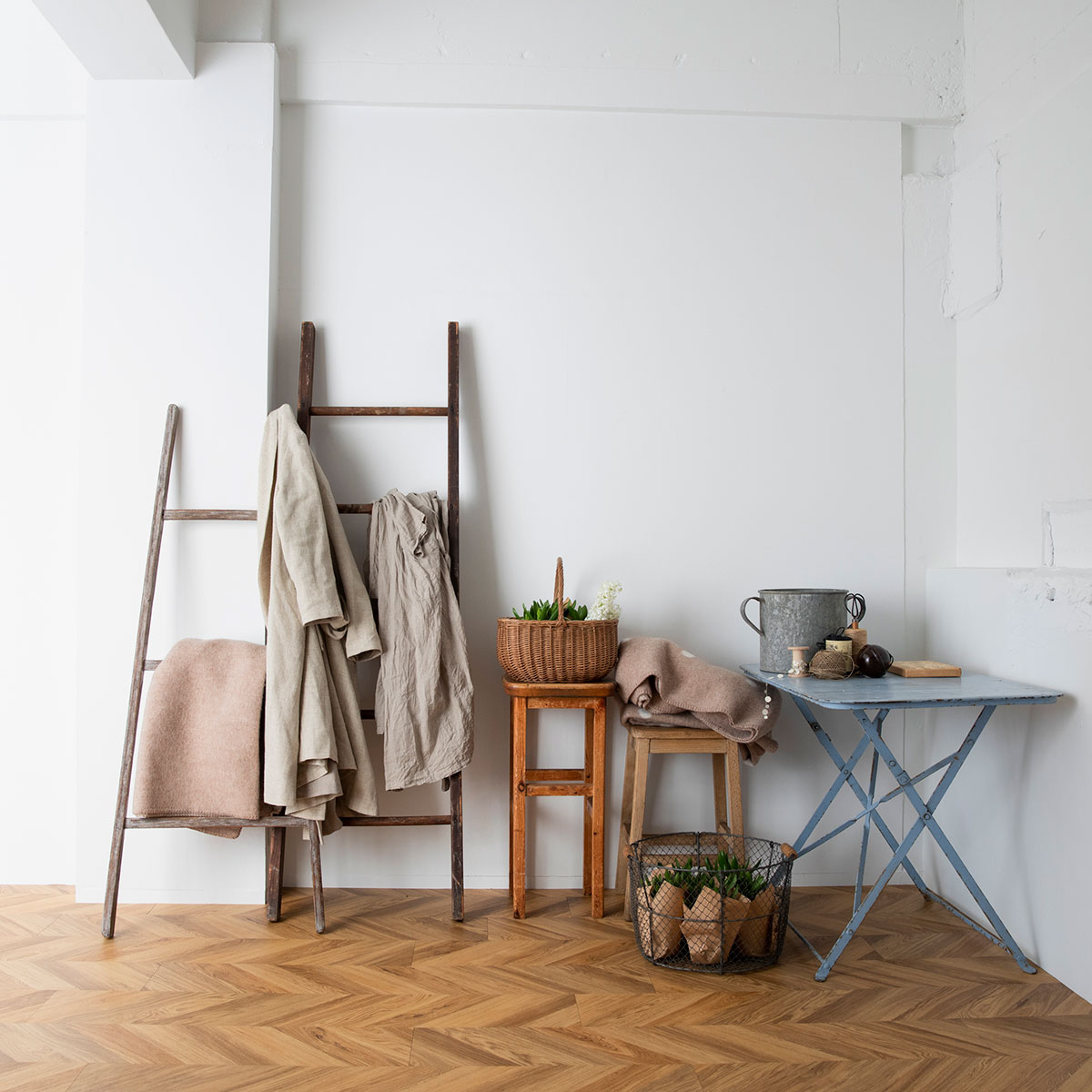スチールのテーブルや、ワイヤーのかごで
