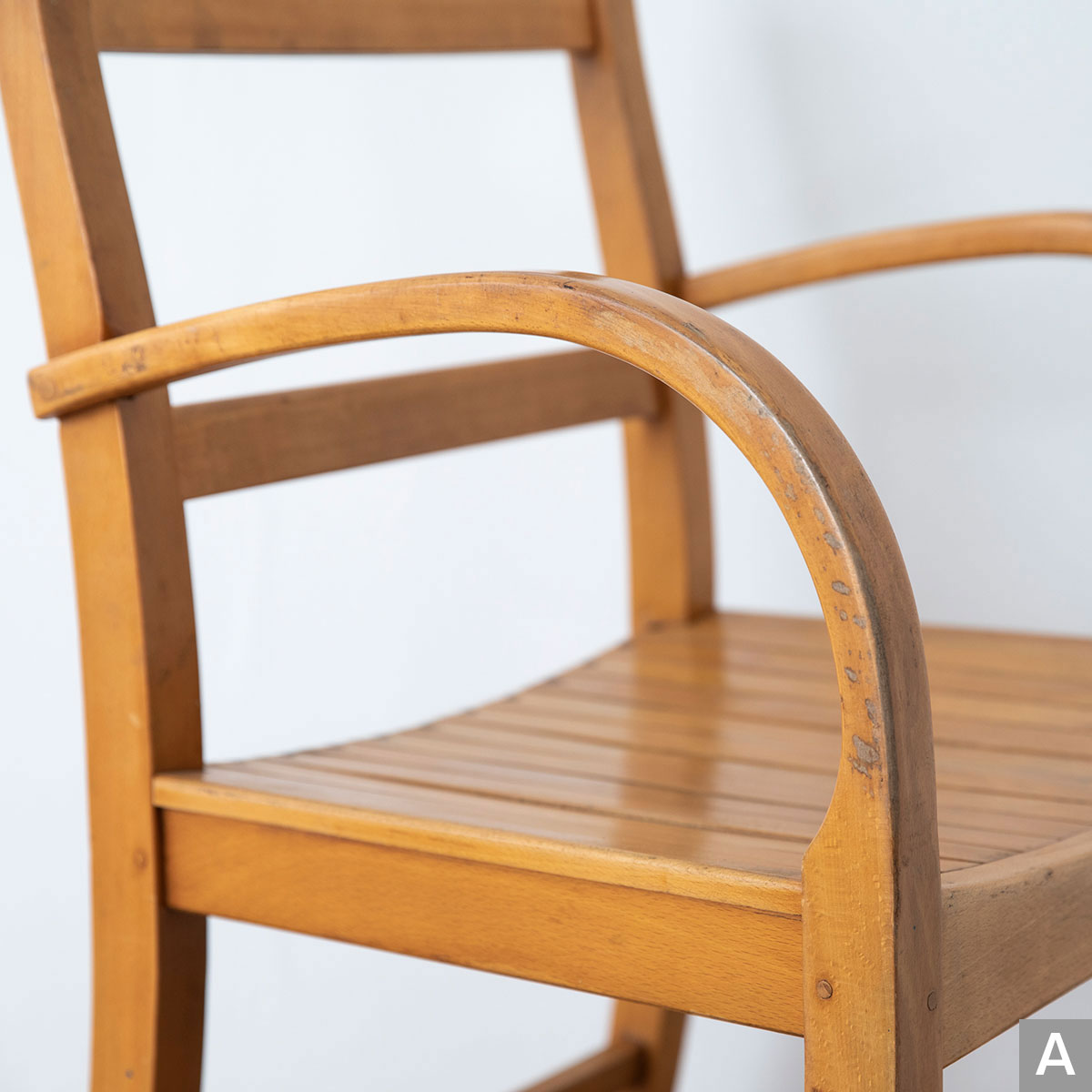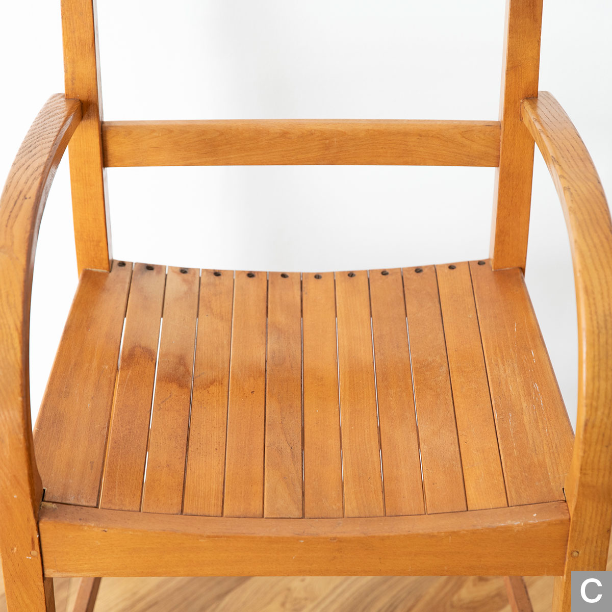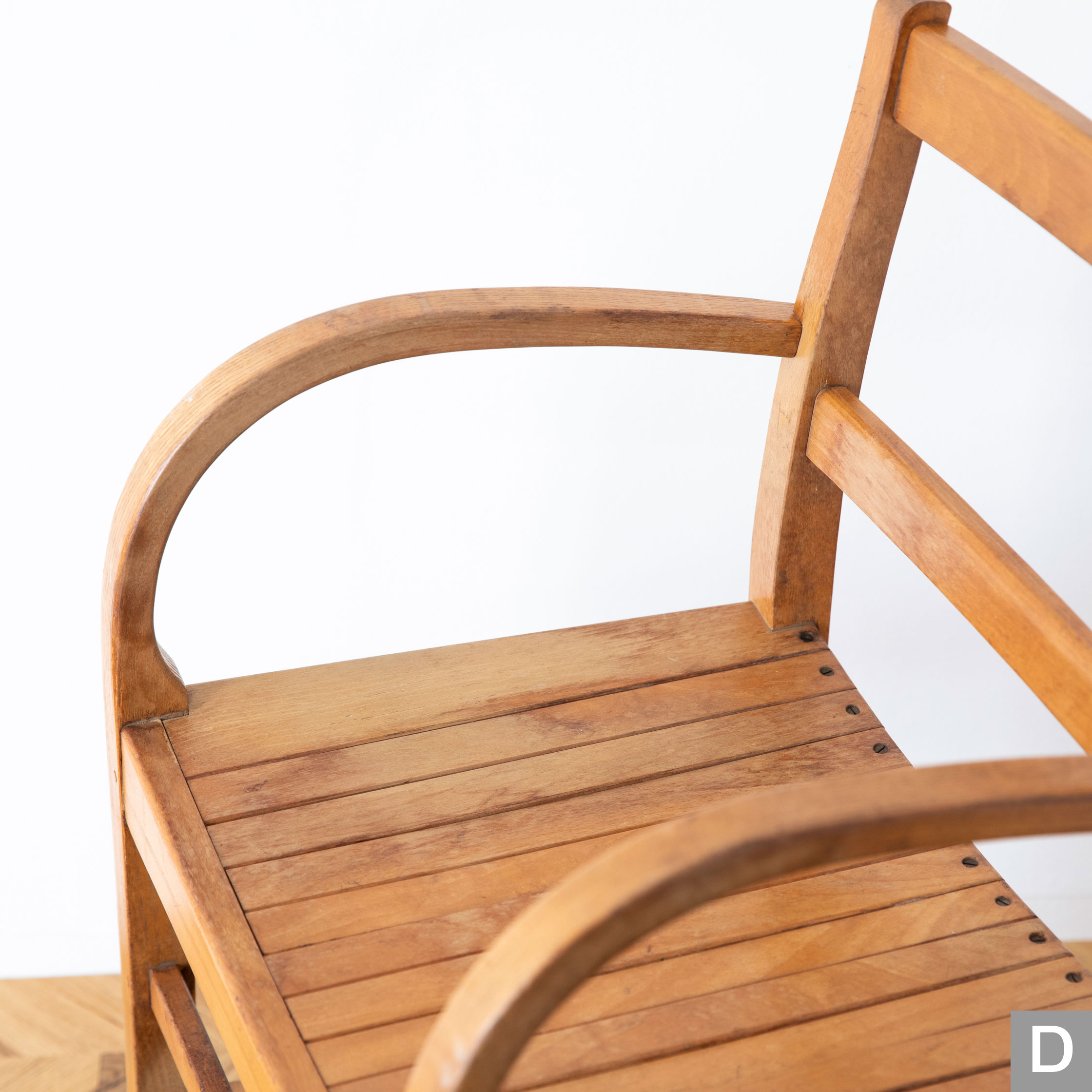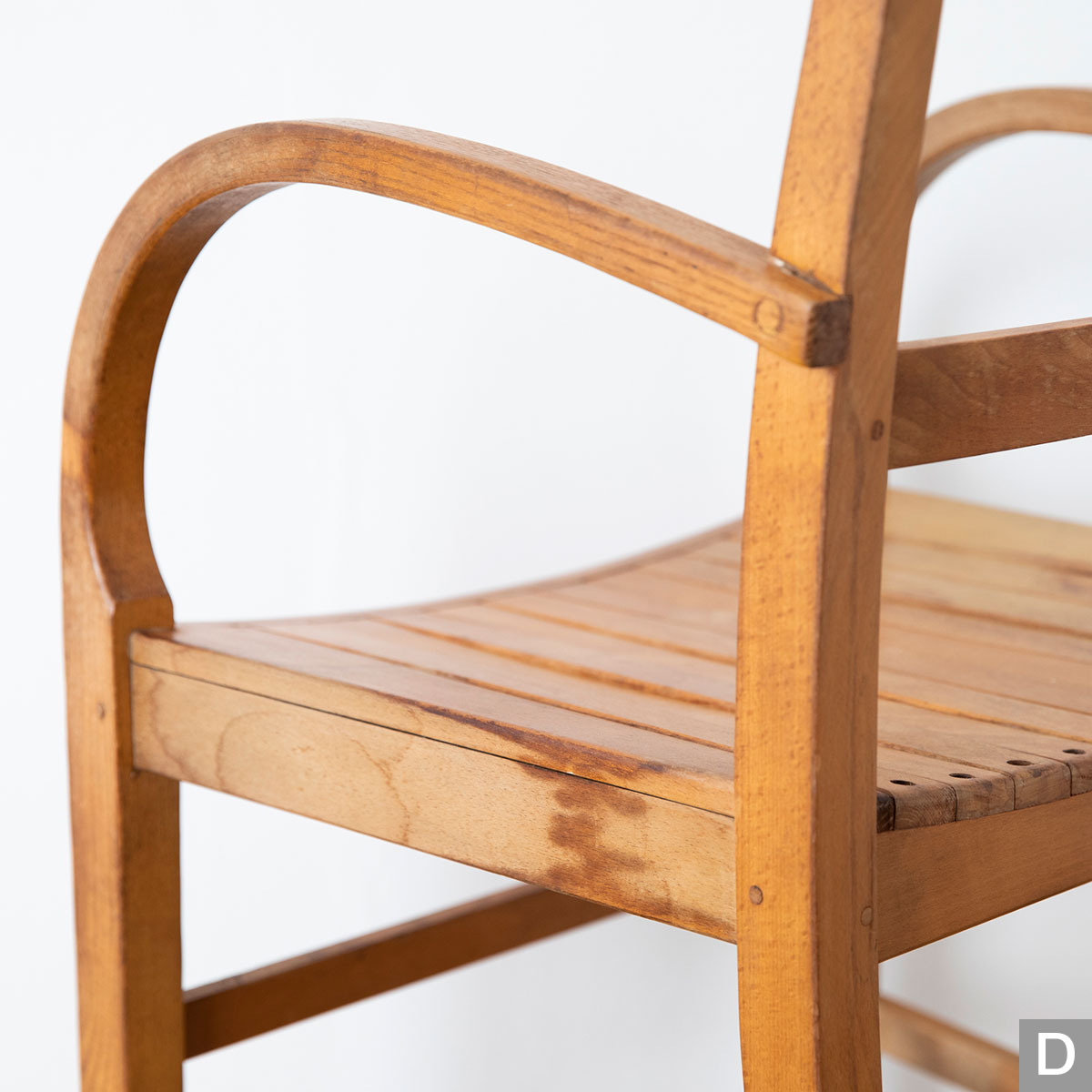 曲木のアームが特徴的なチェアです。