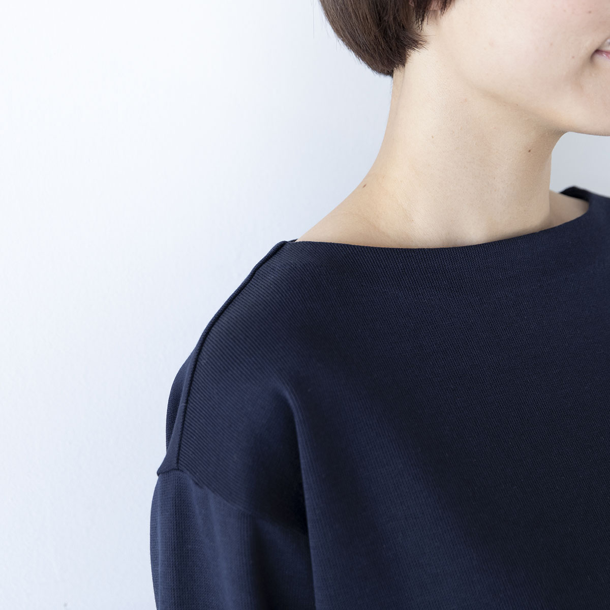 しかも緩やかなボートネックは、首から肩のライン、