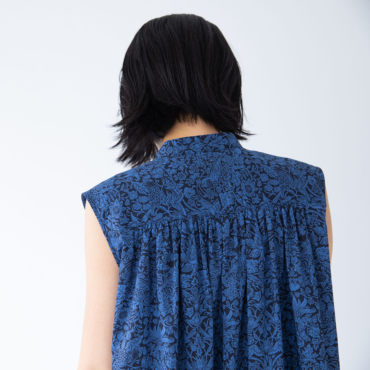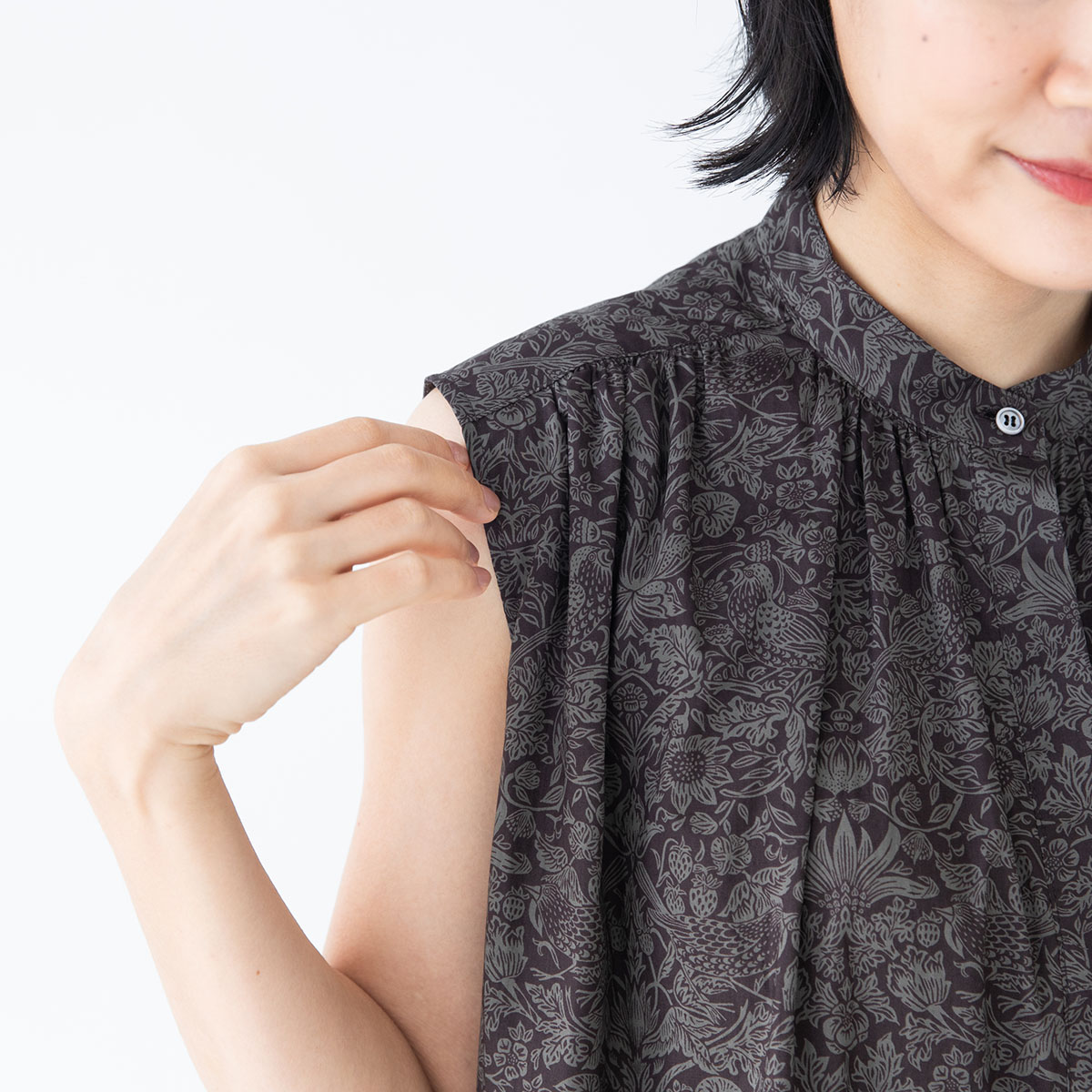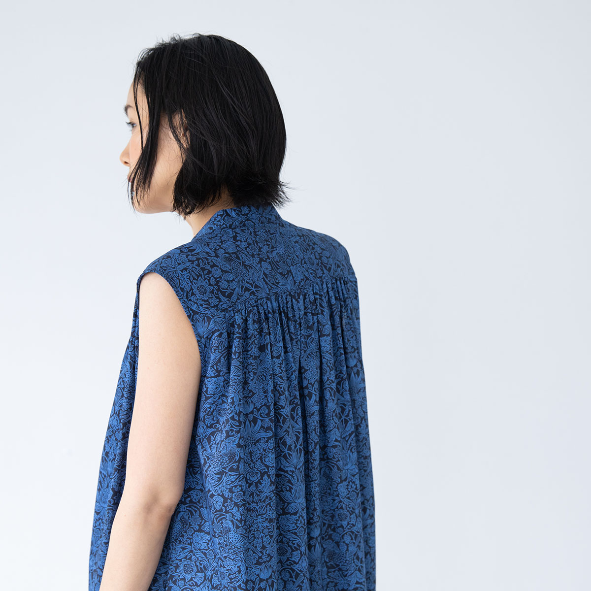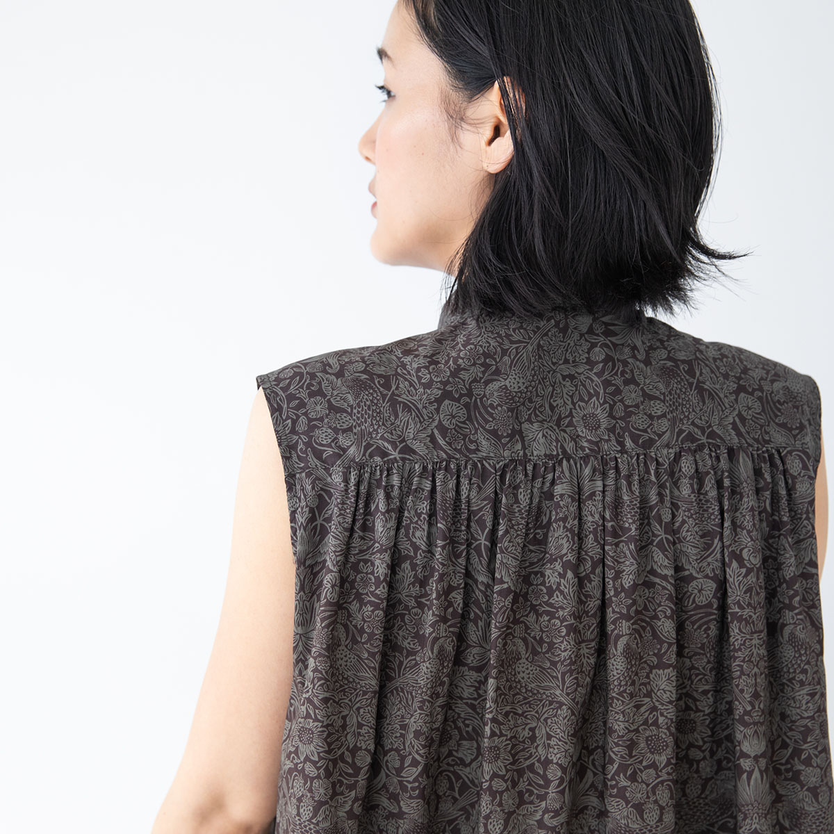 肩から襟ぐりにかけてのギャザーがポイントの