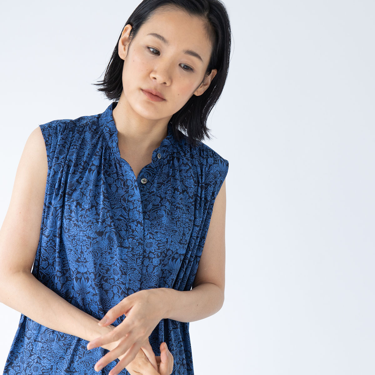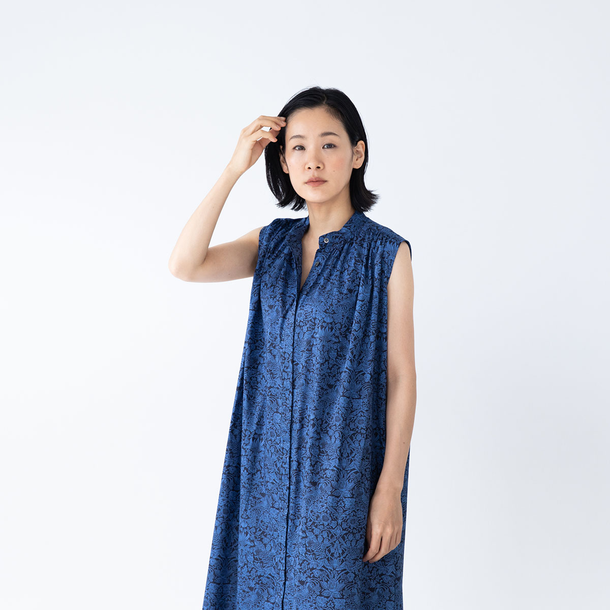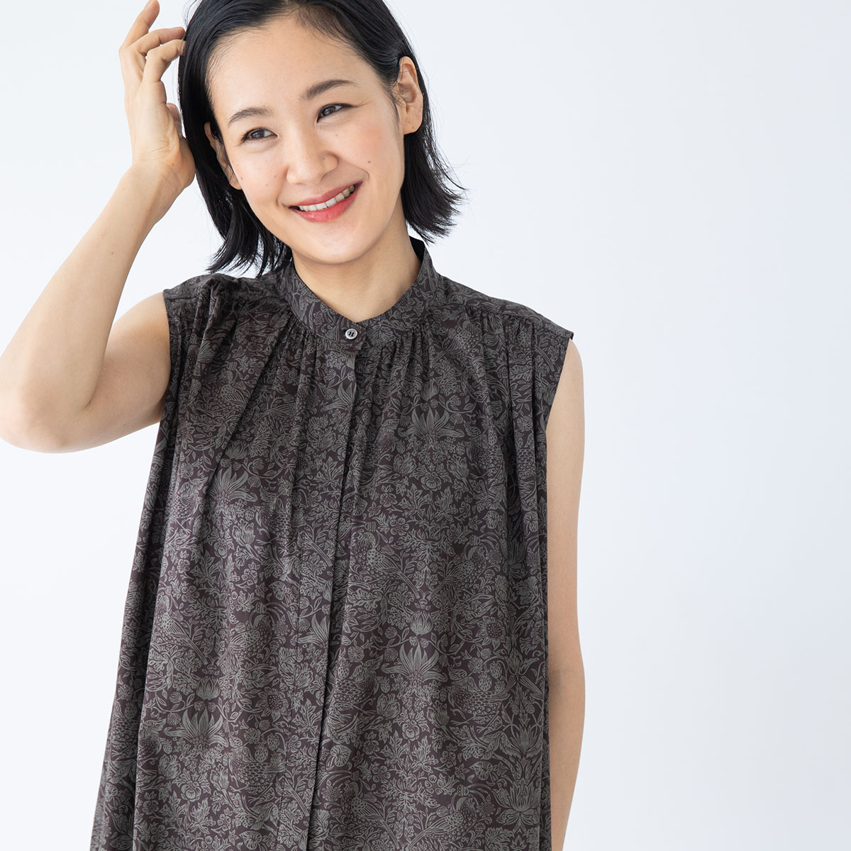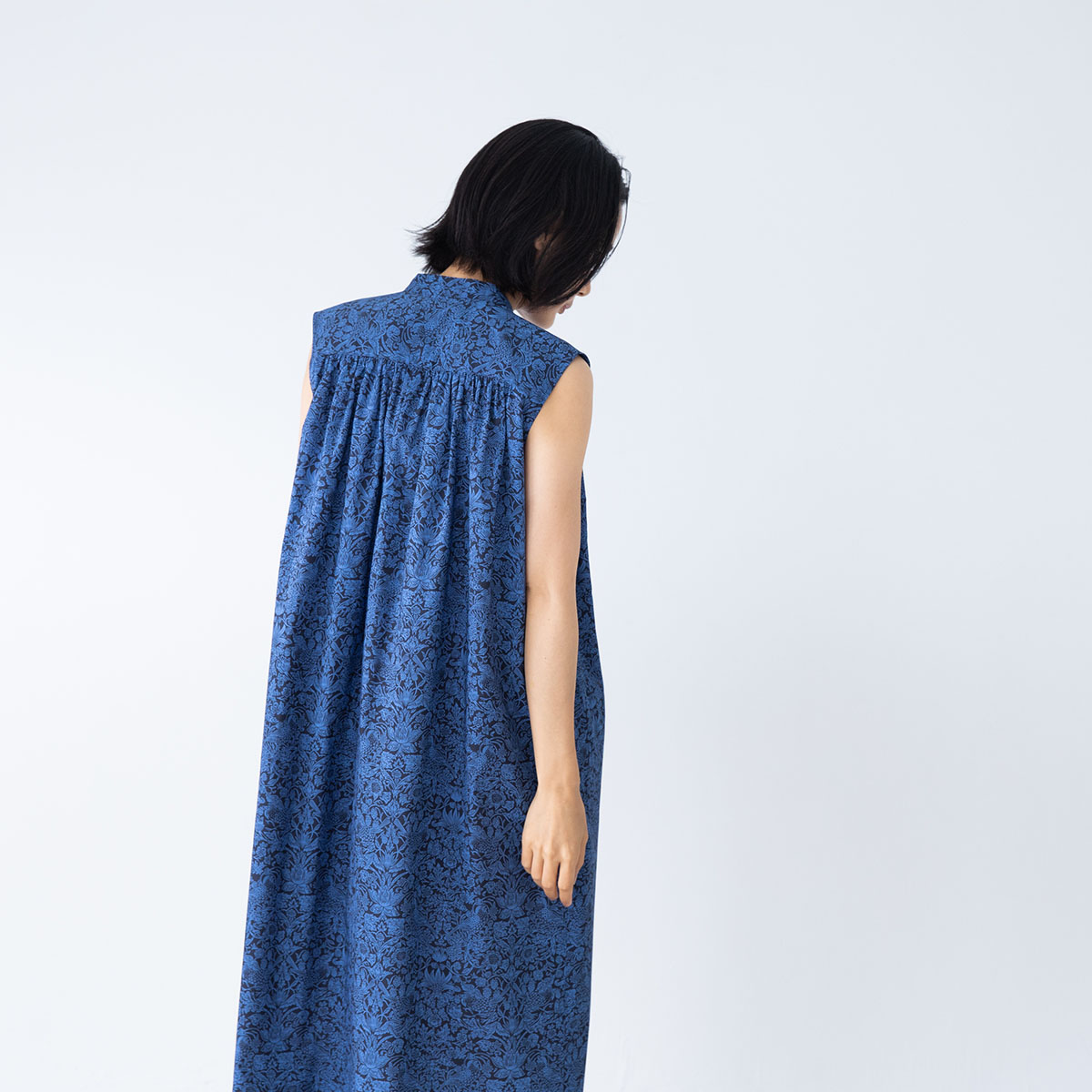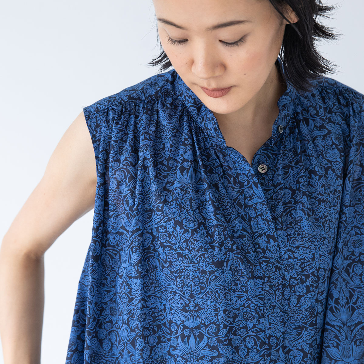 肩から襟ぐりにかけてのギャザーがポイントの