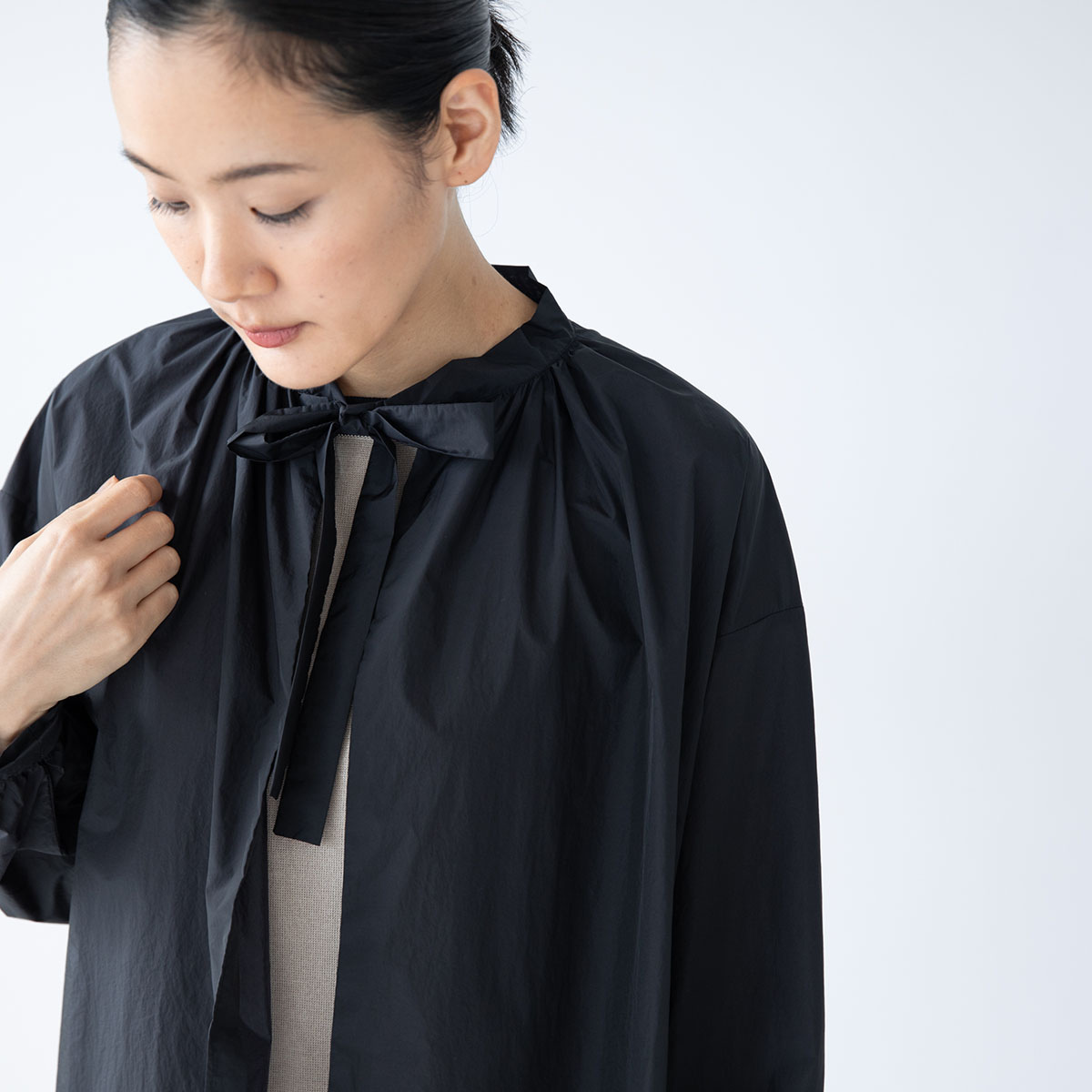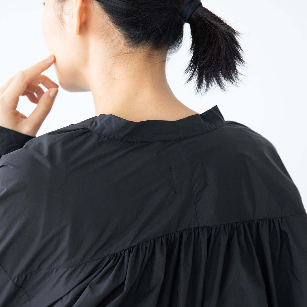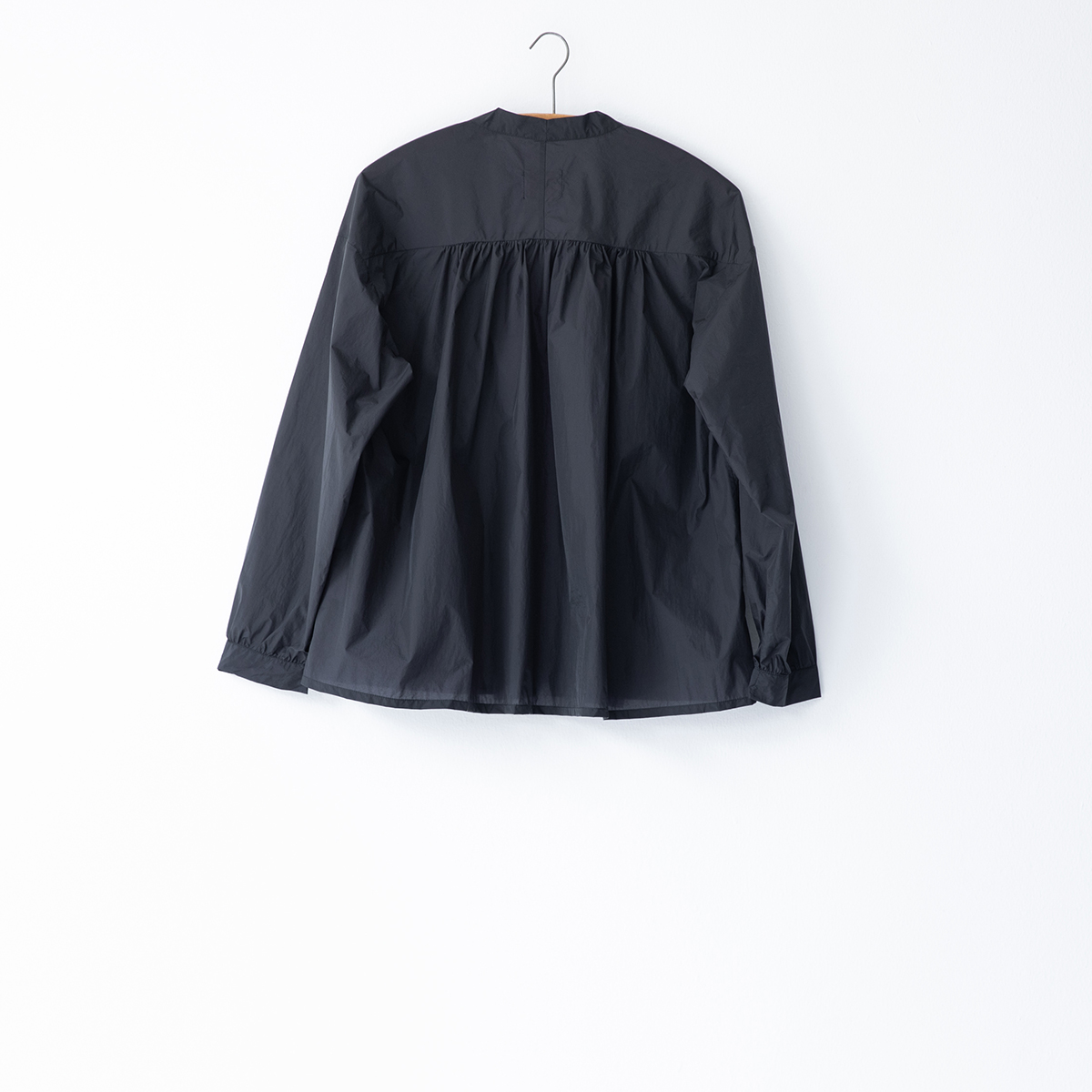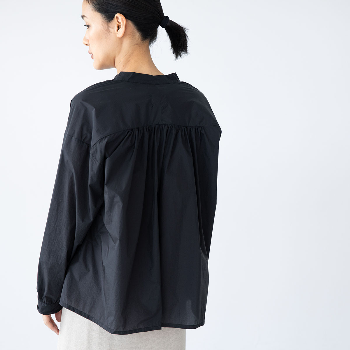 ギャザーが女性らしい柔らかな曲線を描くシャツ。