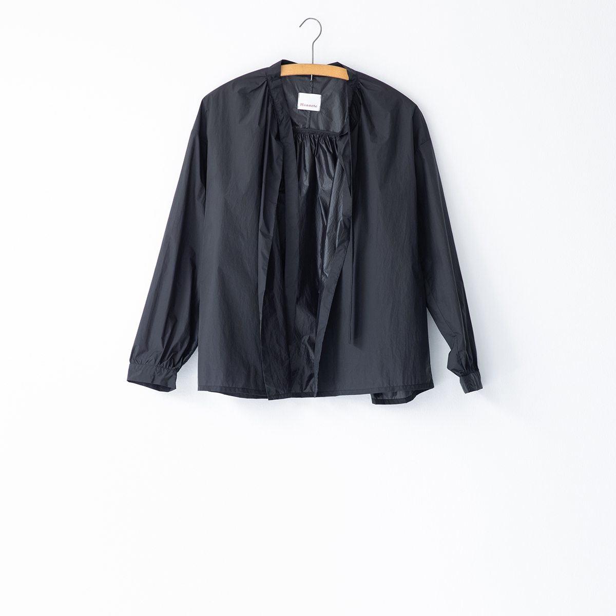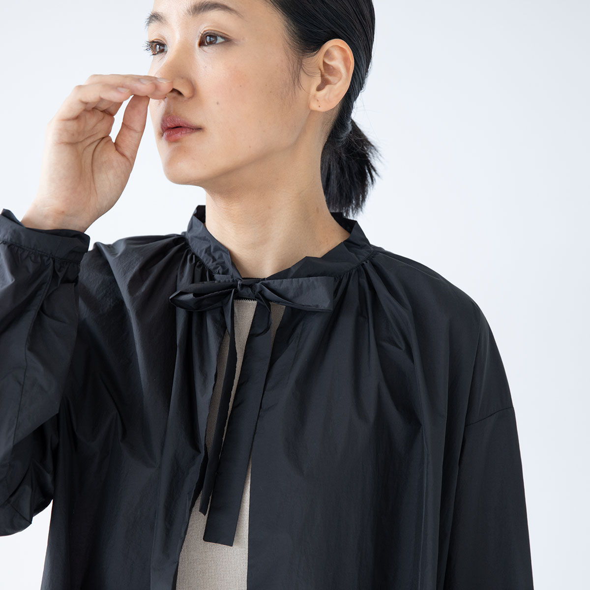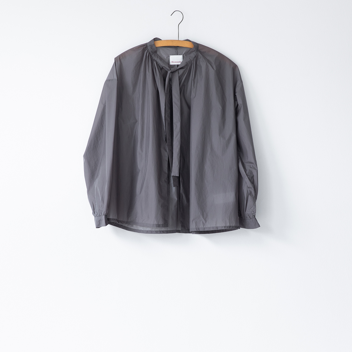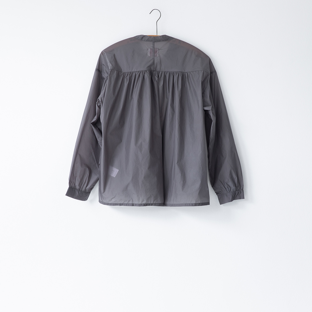 ギャザーが女性らしい柔らかな曲線を描くシャツ。