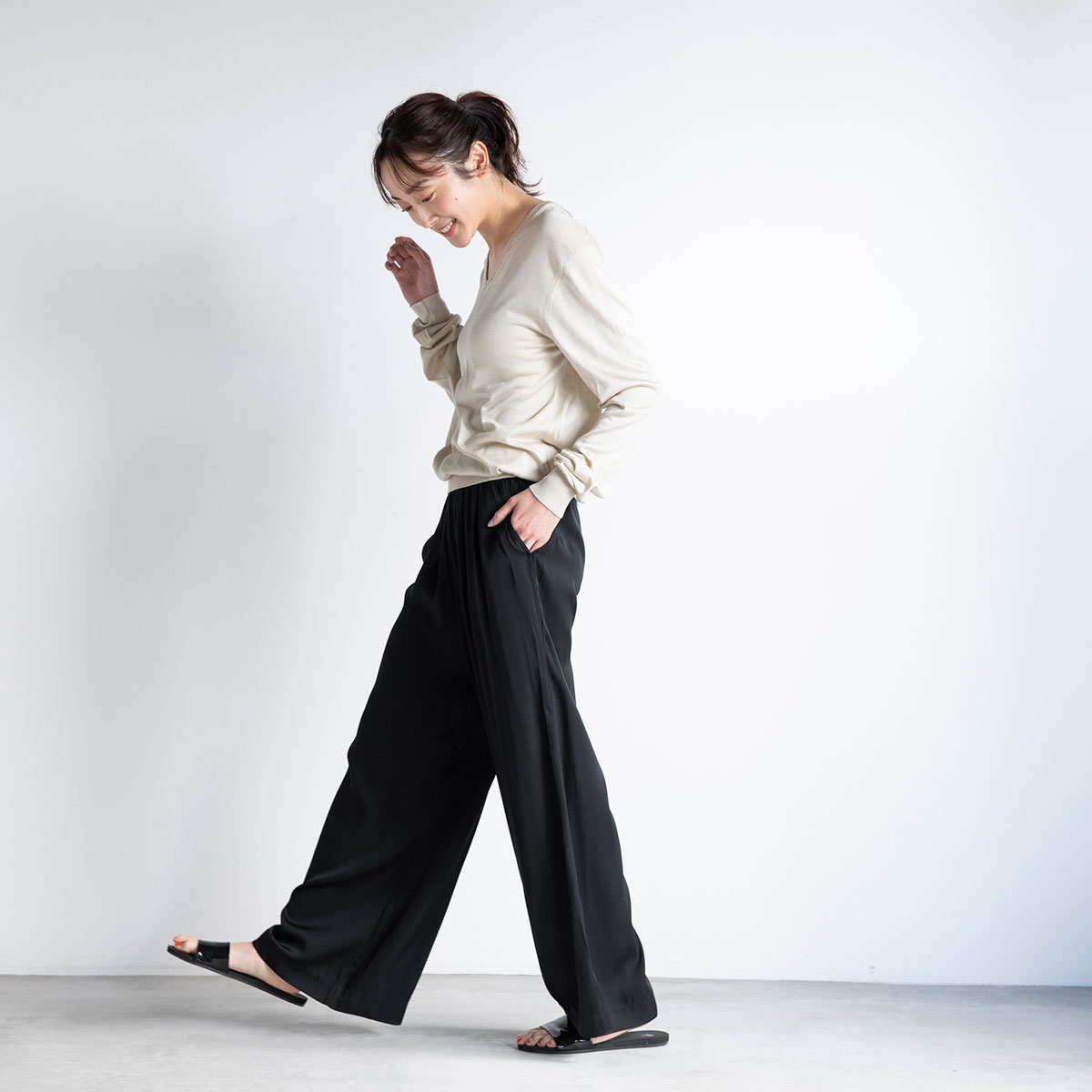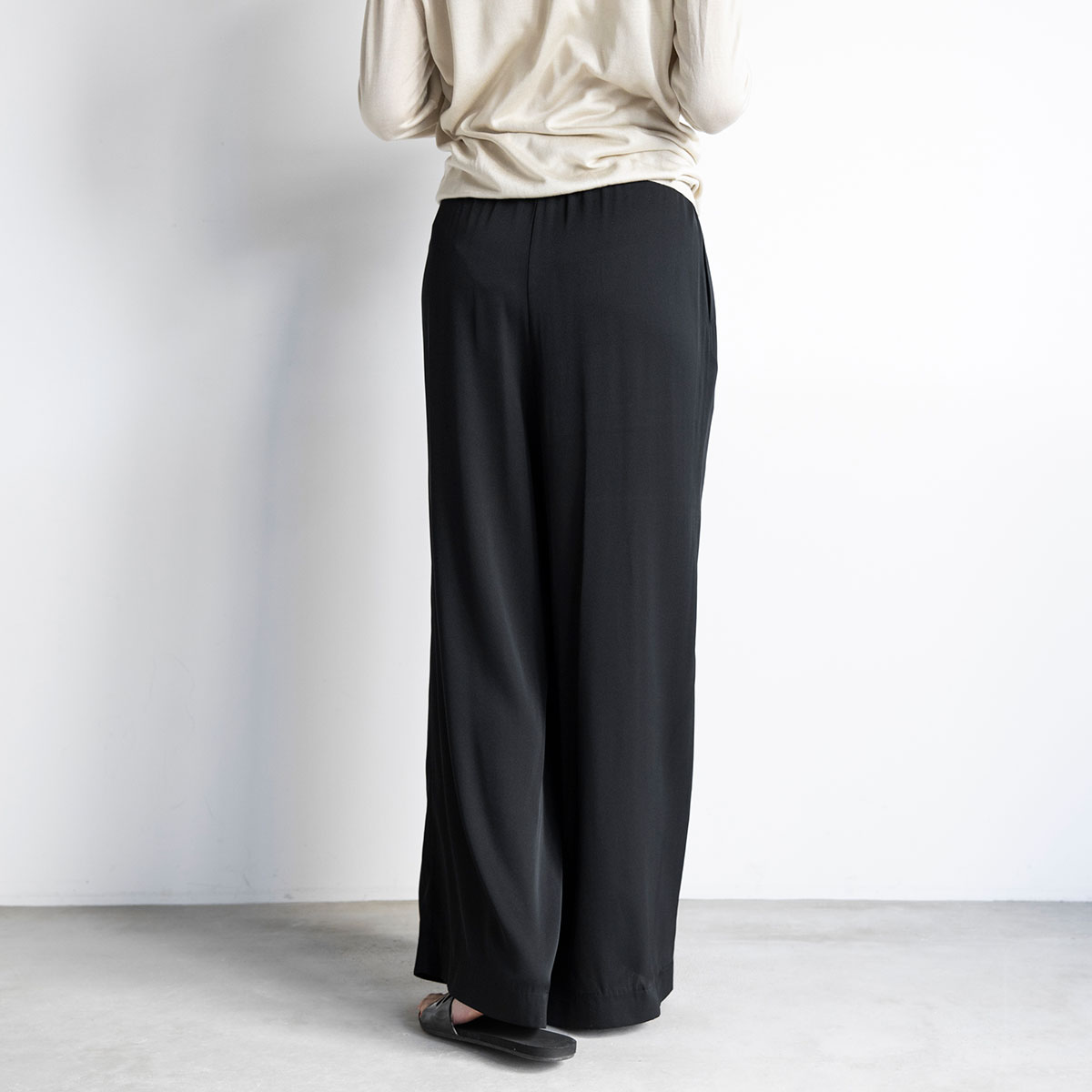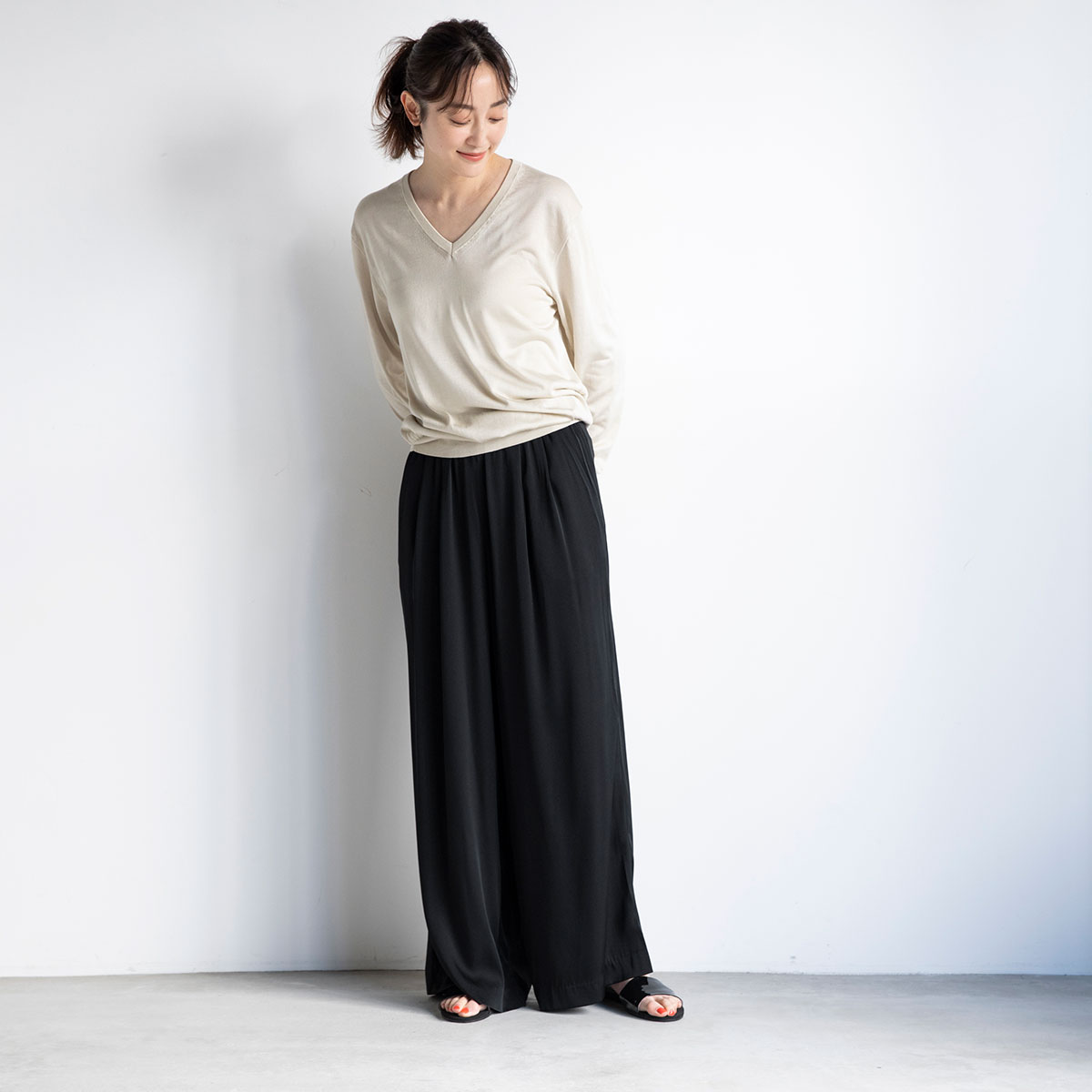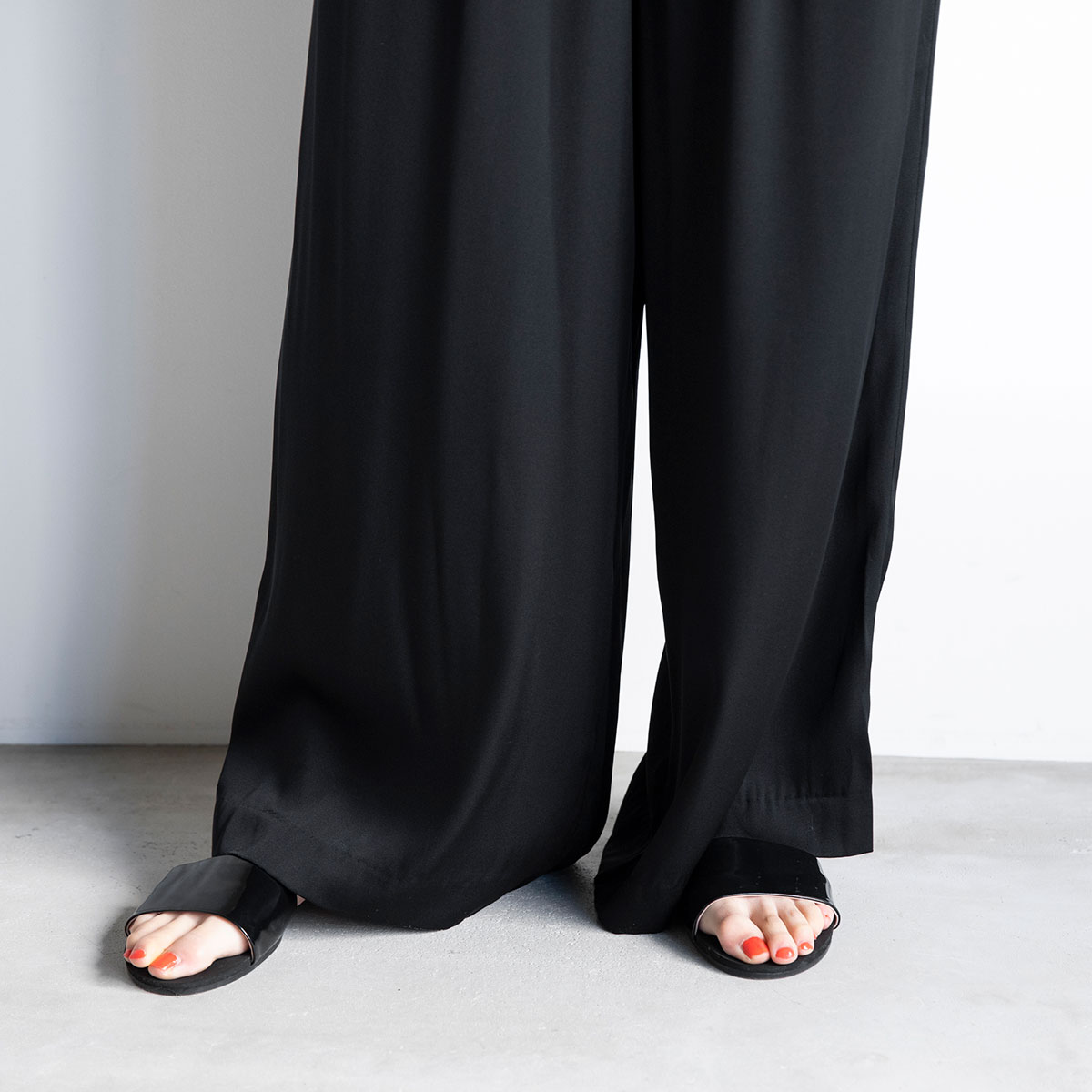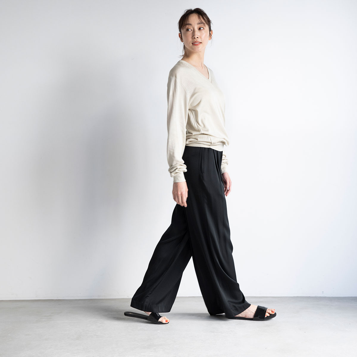 シルク90%、ストレッチサテン織物のワイドパンツです。