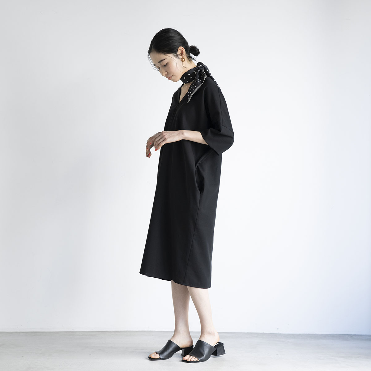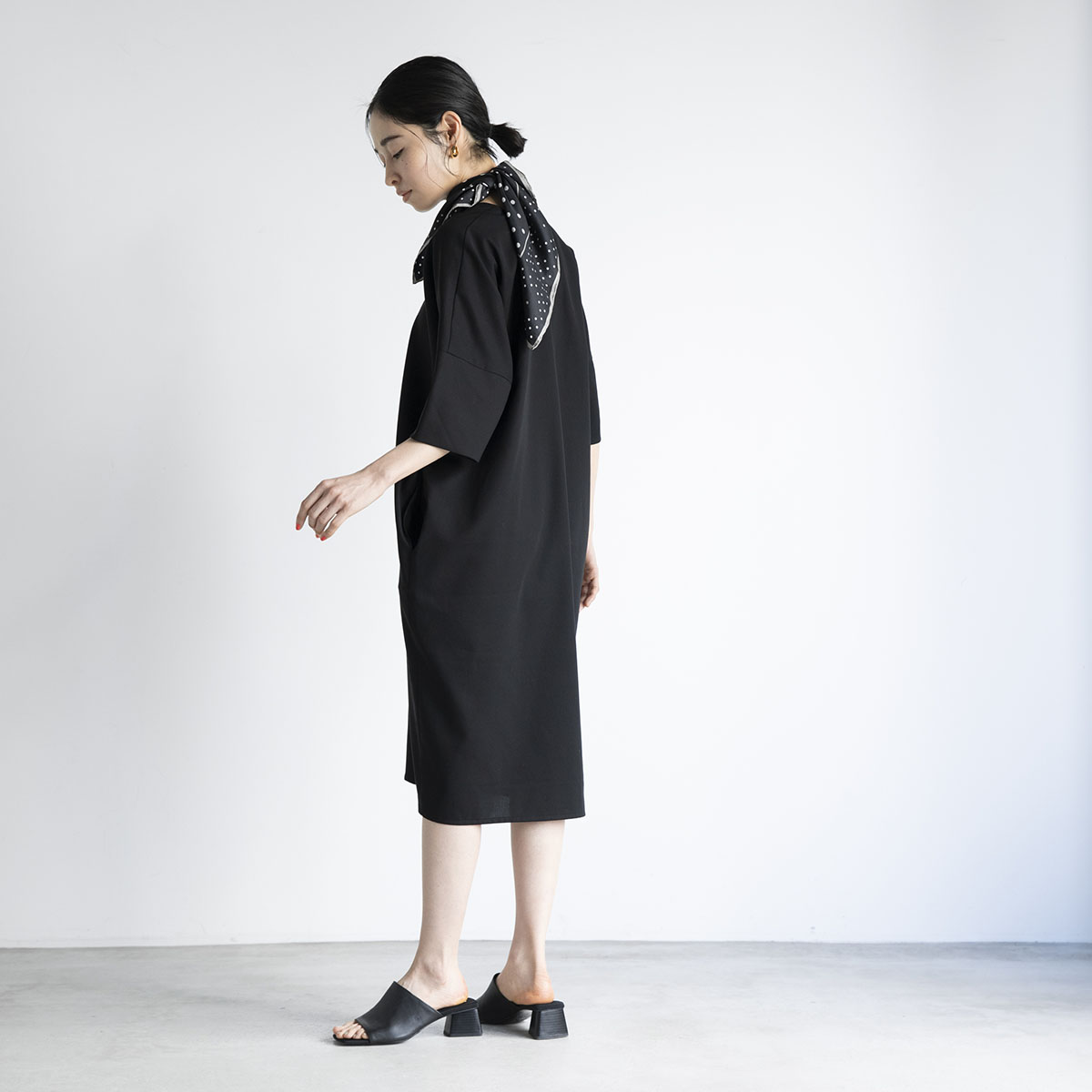 サンダルは、バッグの黒と同色にすると、