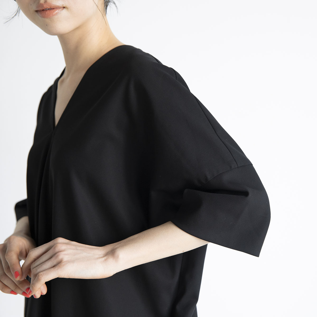 袖を通すとフロントからドレープが流れ、