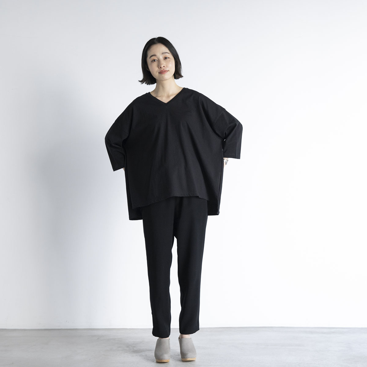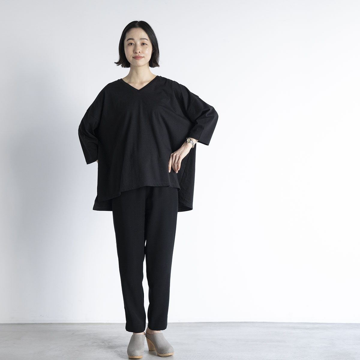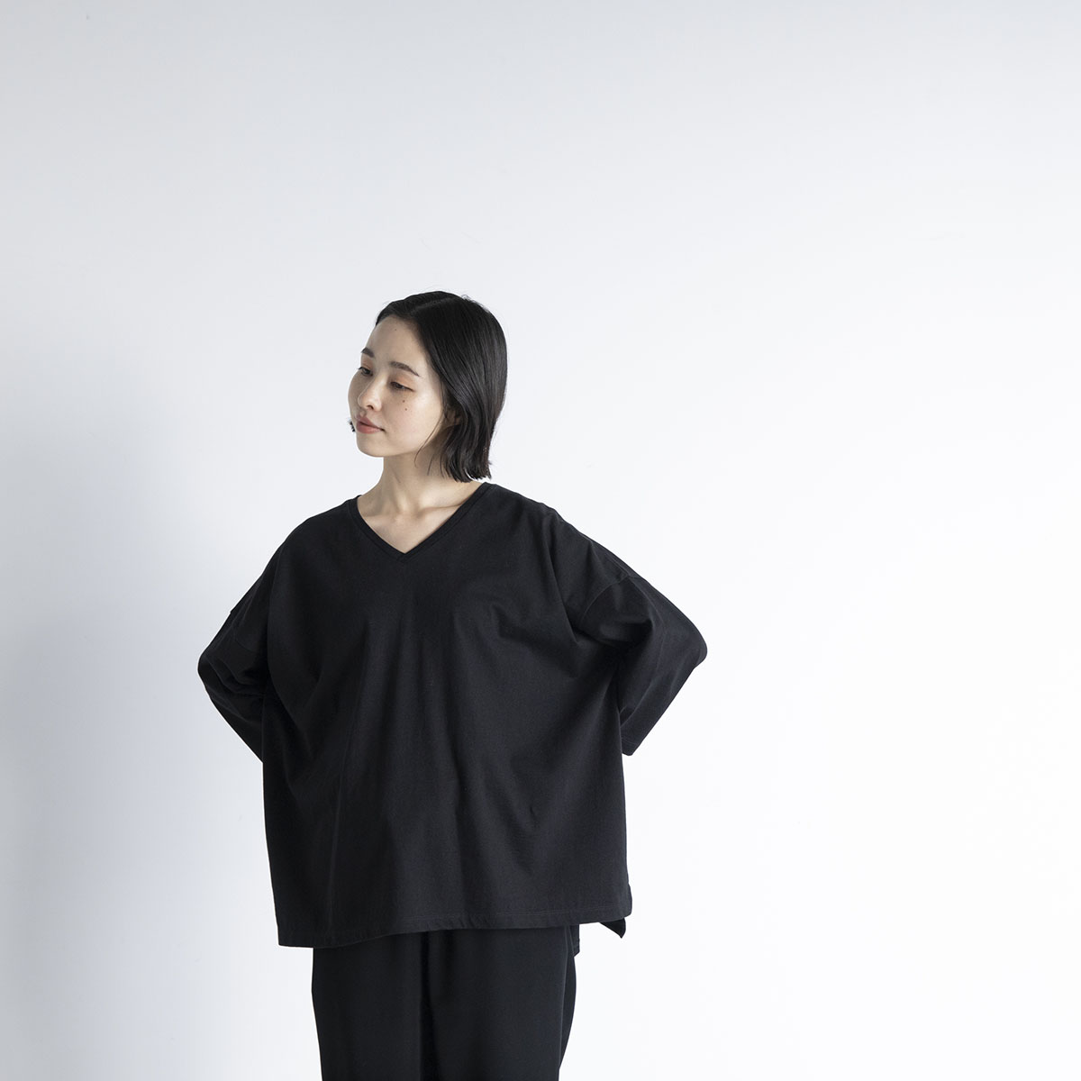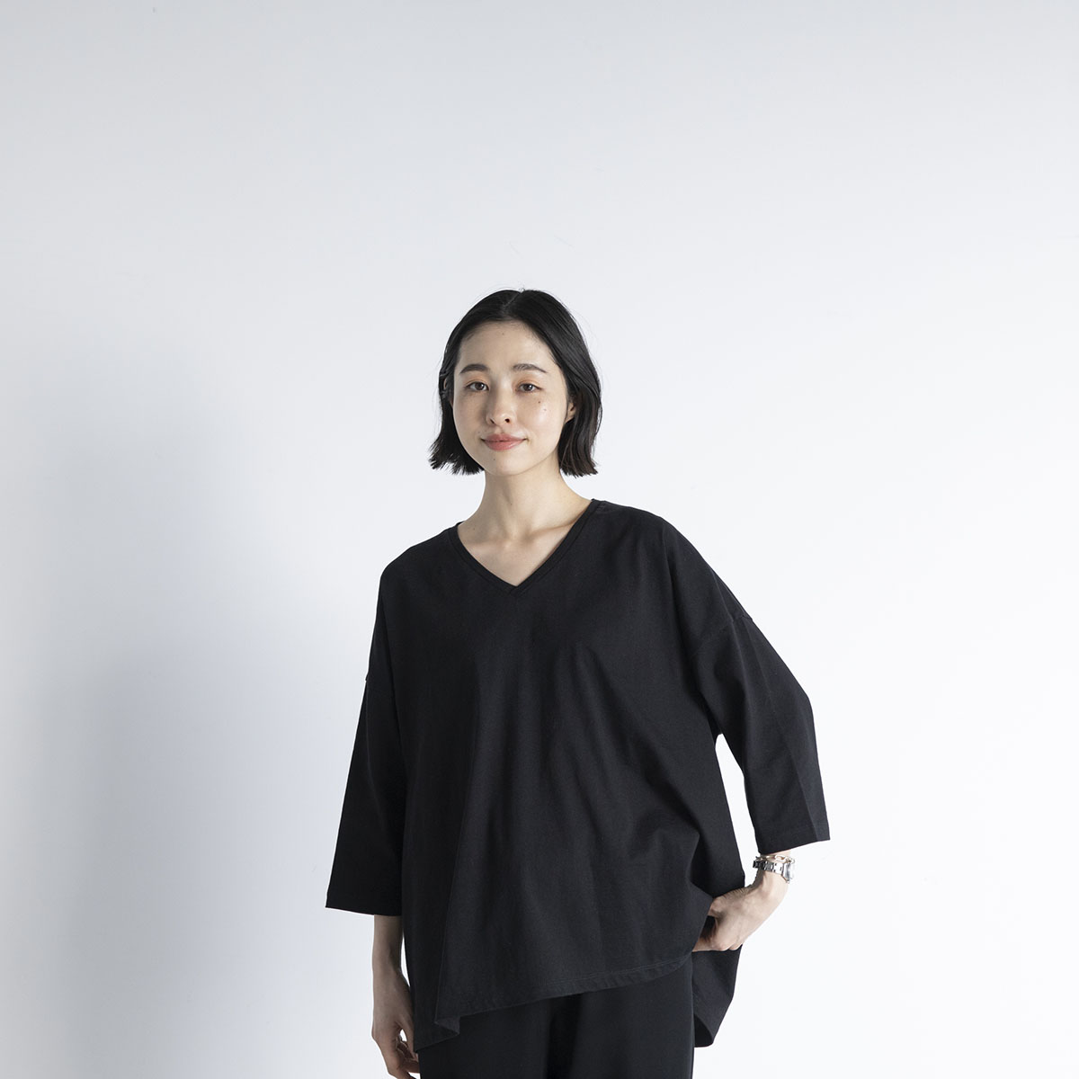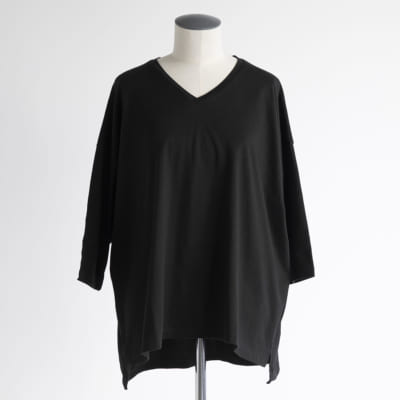 Vネック七分丈Tシャツ(ブラック)/STAMP AND DIARY