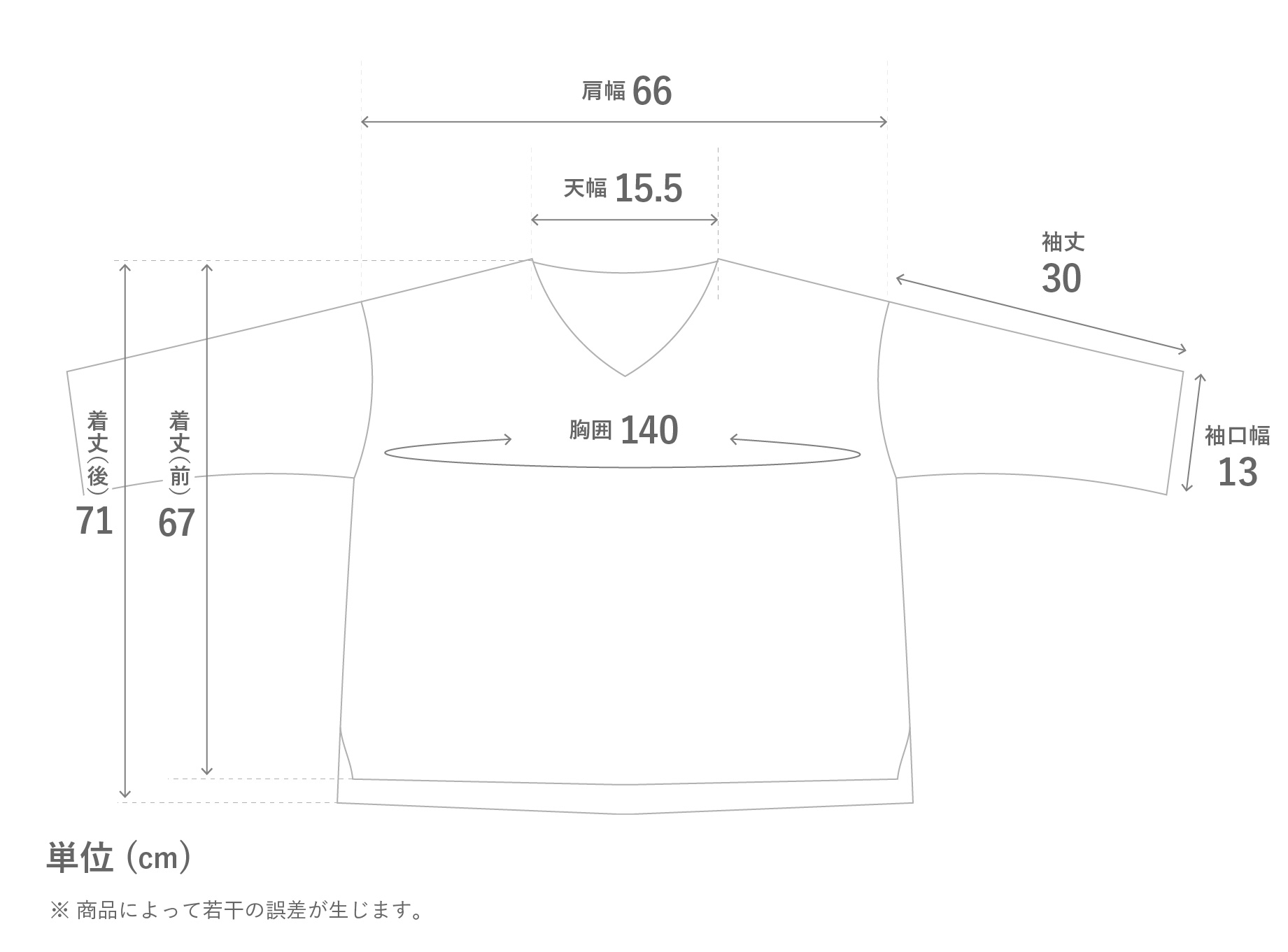 | 前着丈 | 後着丈 | 肩幅 | 胸囲 | 天幅 | 肩幅 | 袖丈 | 袖口幅 |