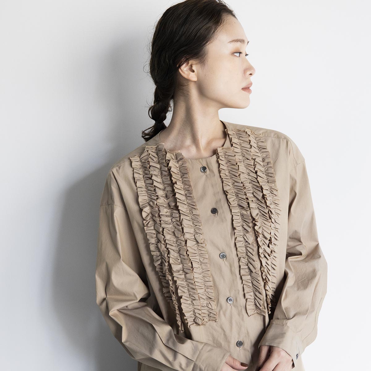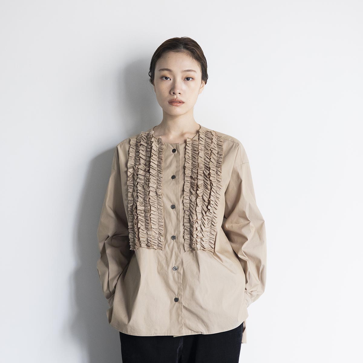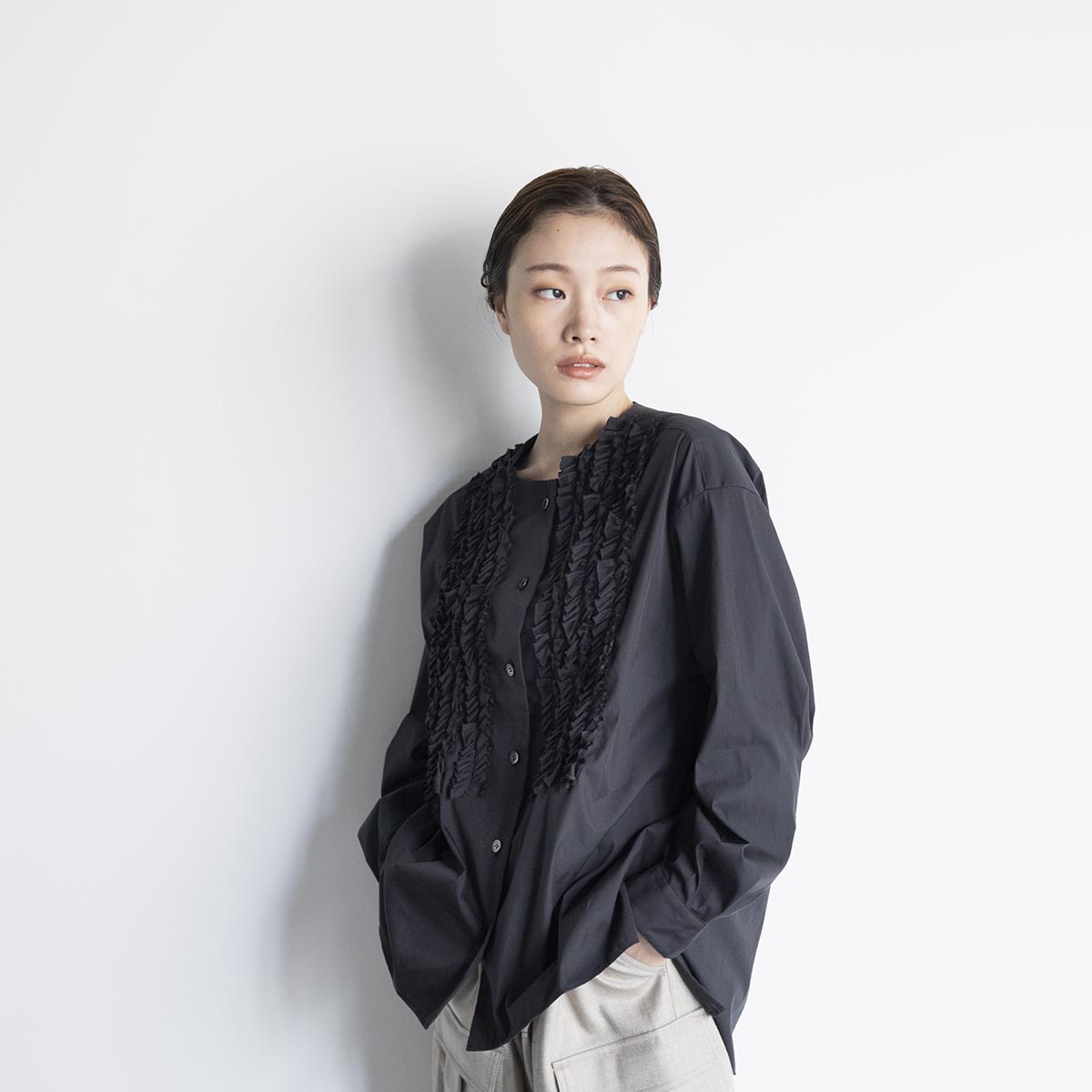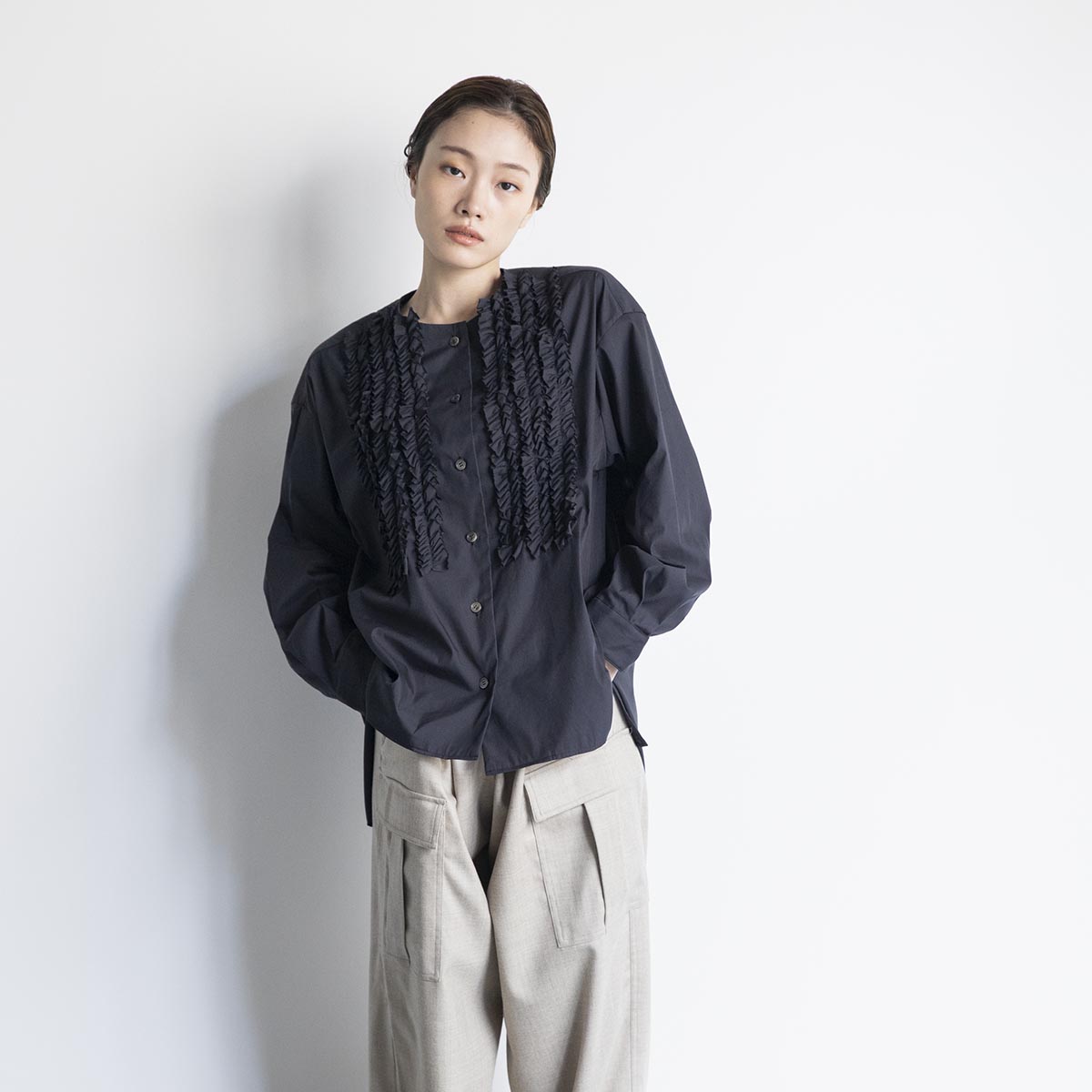 胸元のギャザーフリルがポイントのノーカラーシャツ。