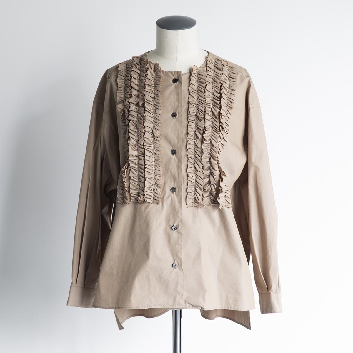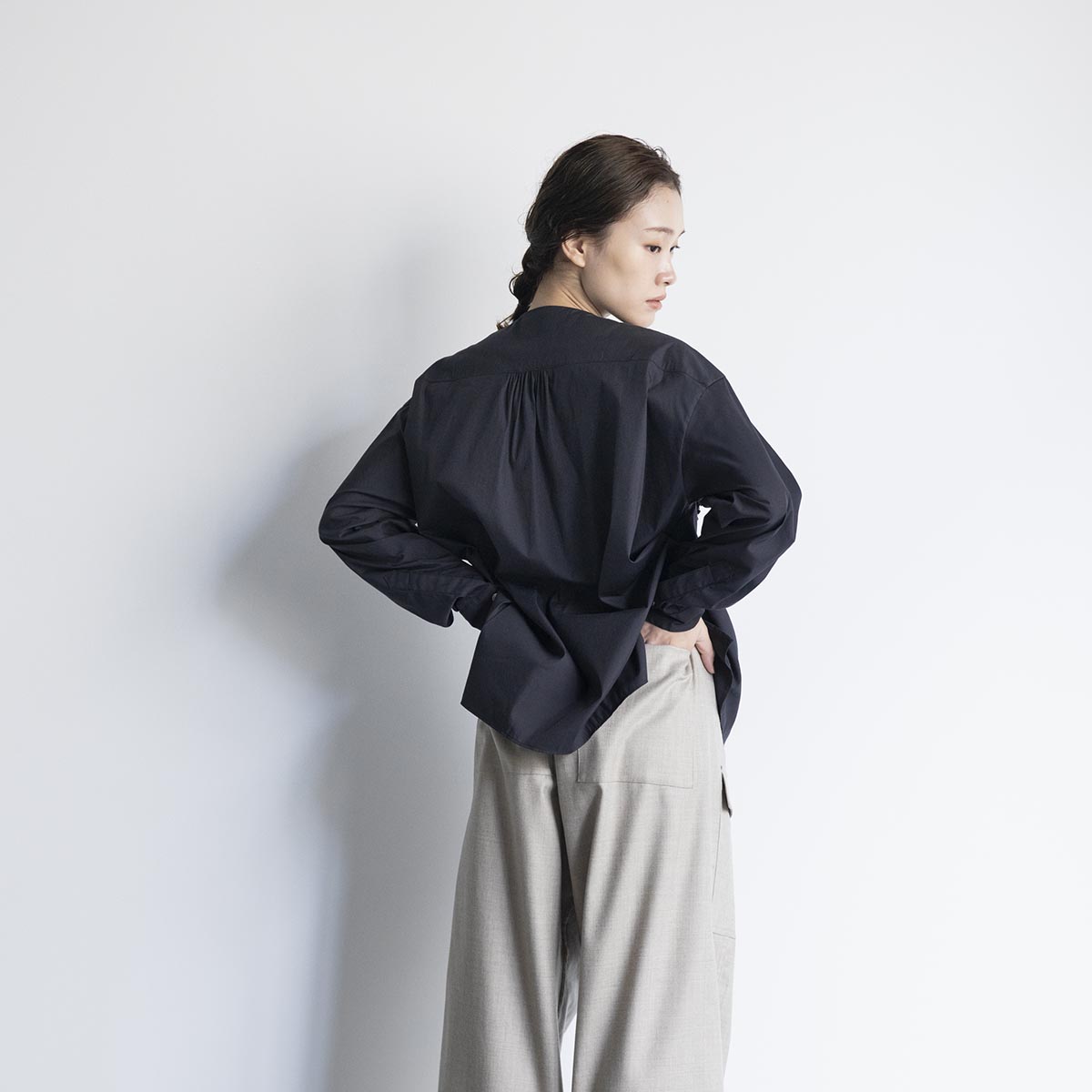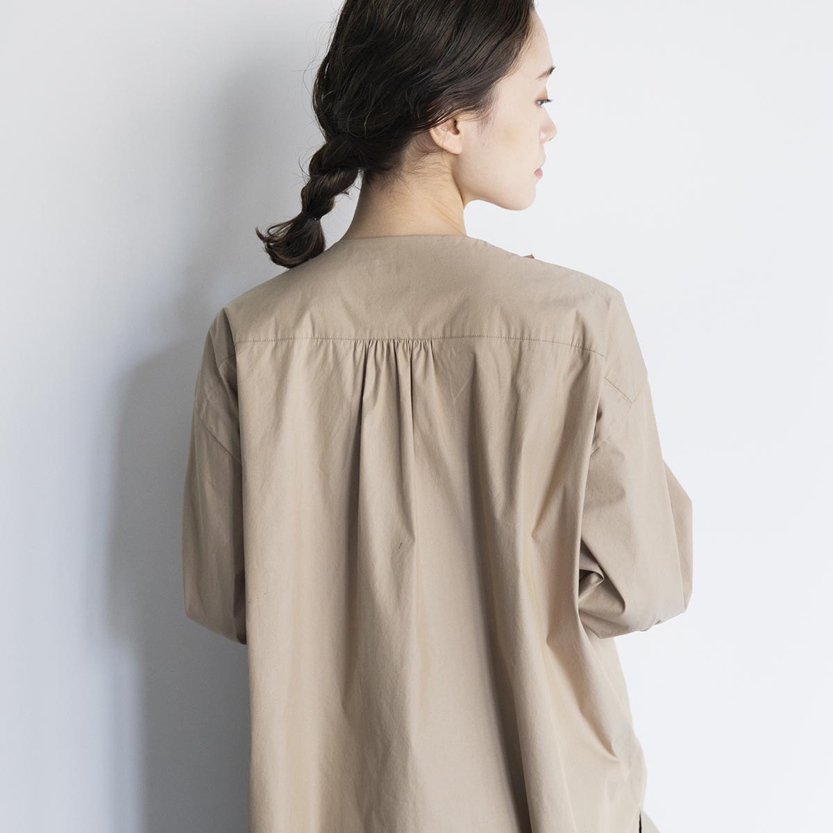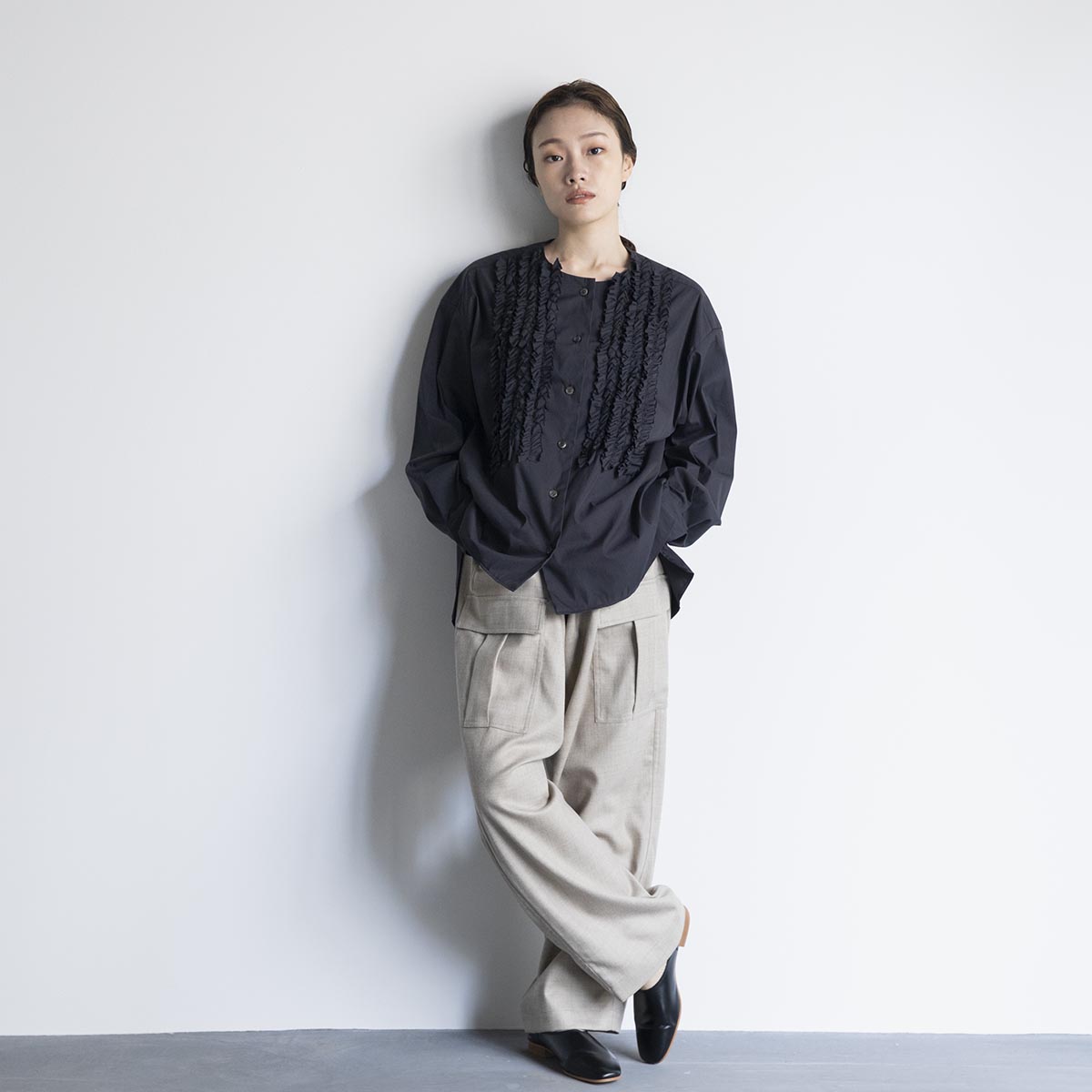 胸元のギャザーフリルがポイントのノーカラーシャツ。