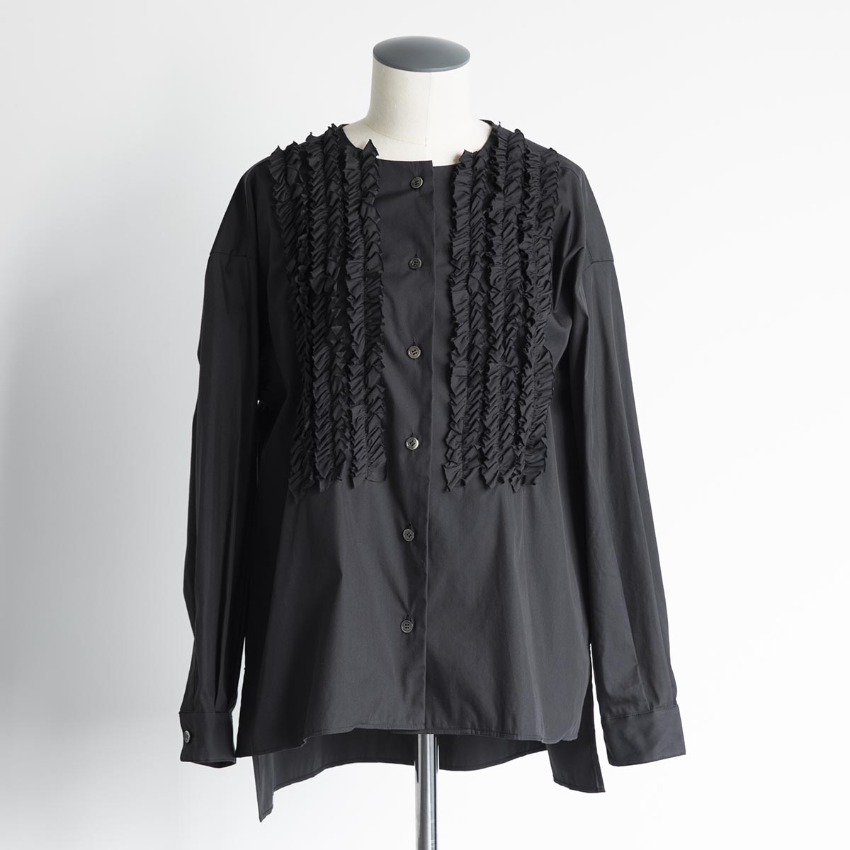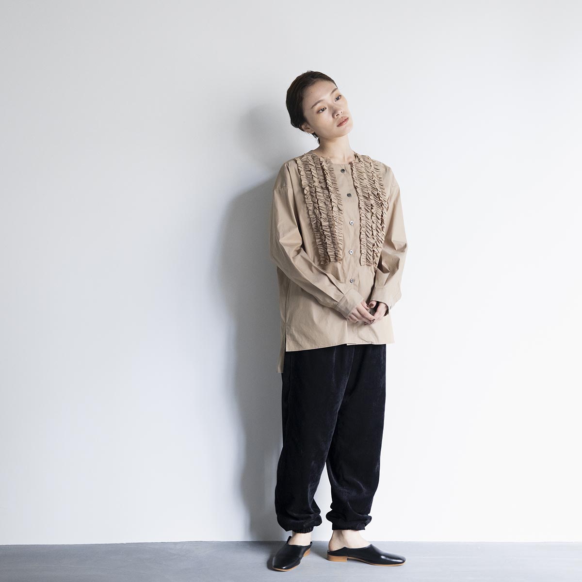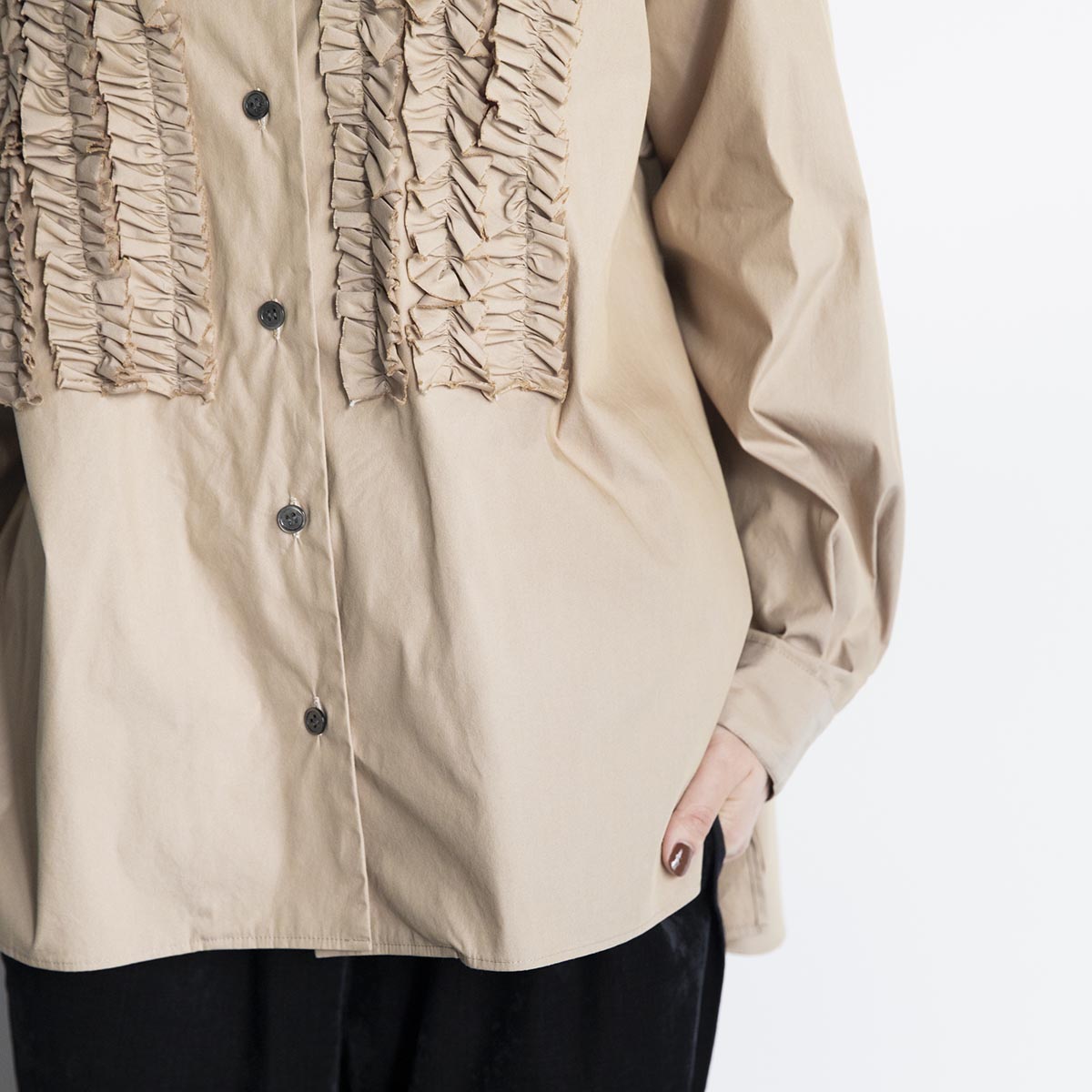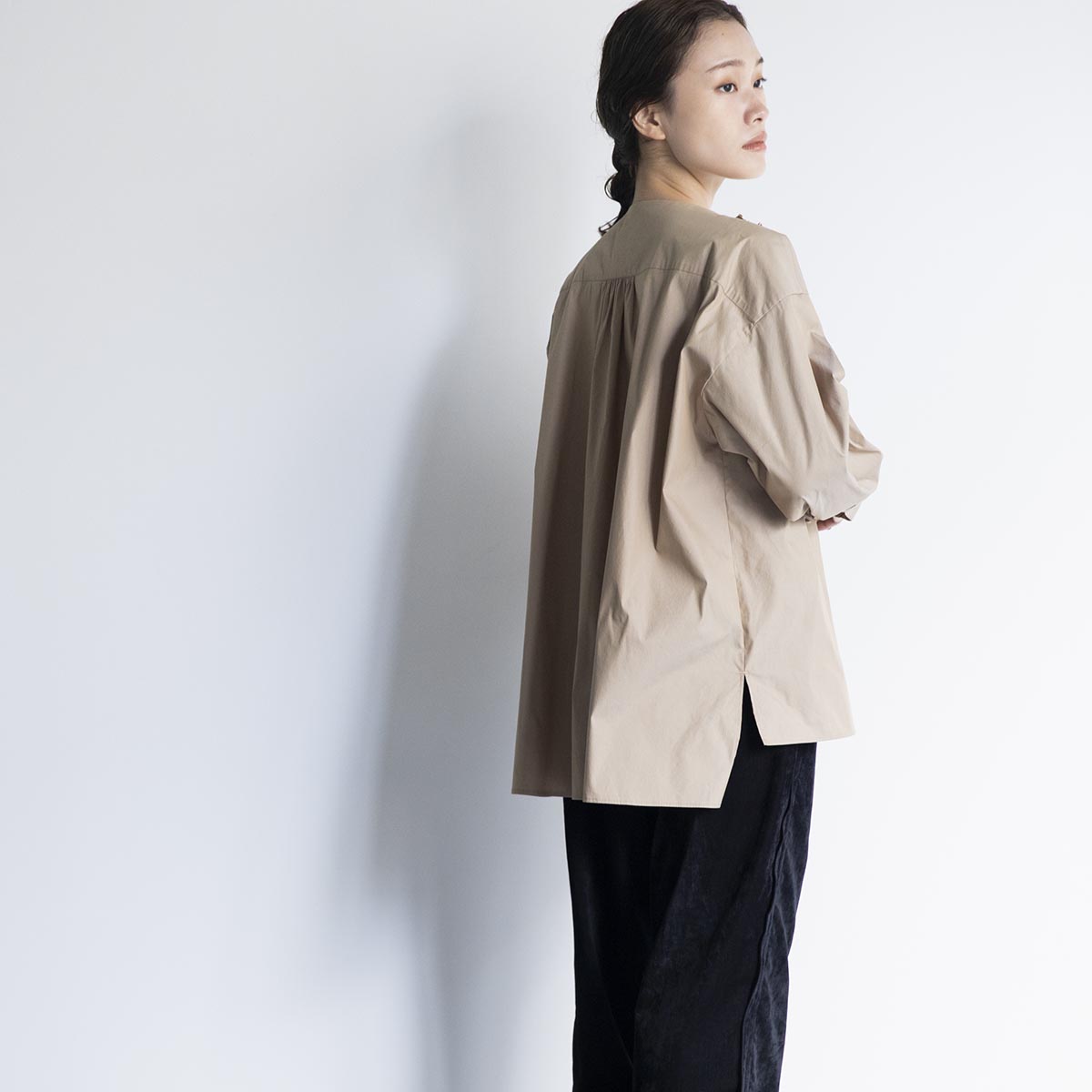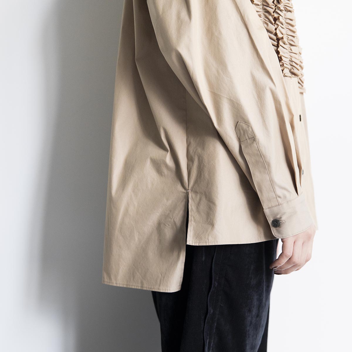 胸元のギャザーフリルがポイントのノーカラーシャツ。