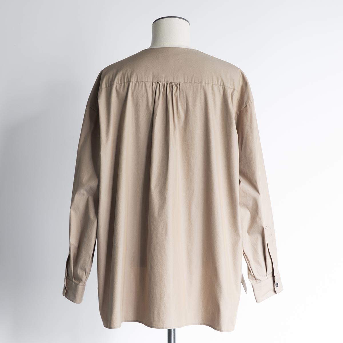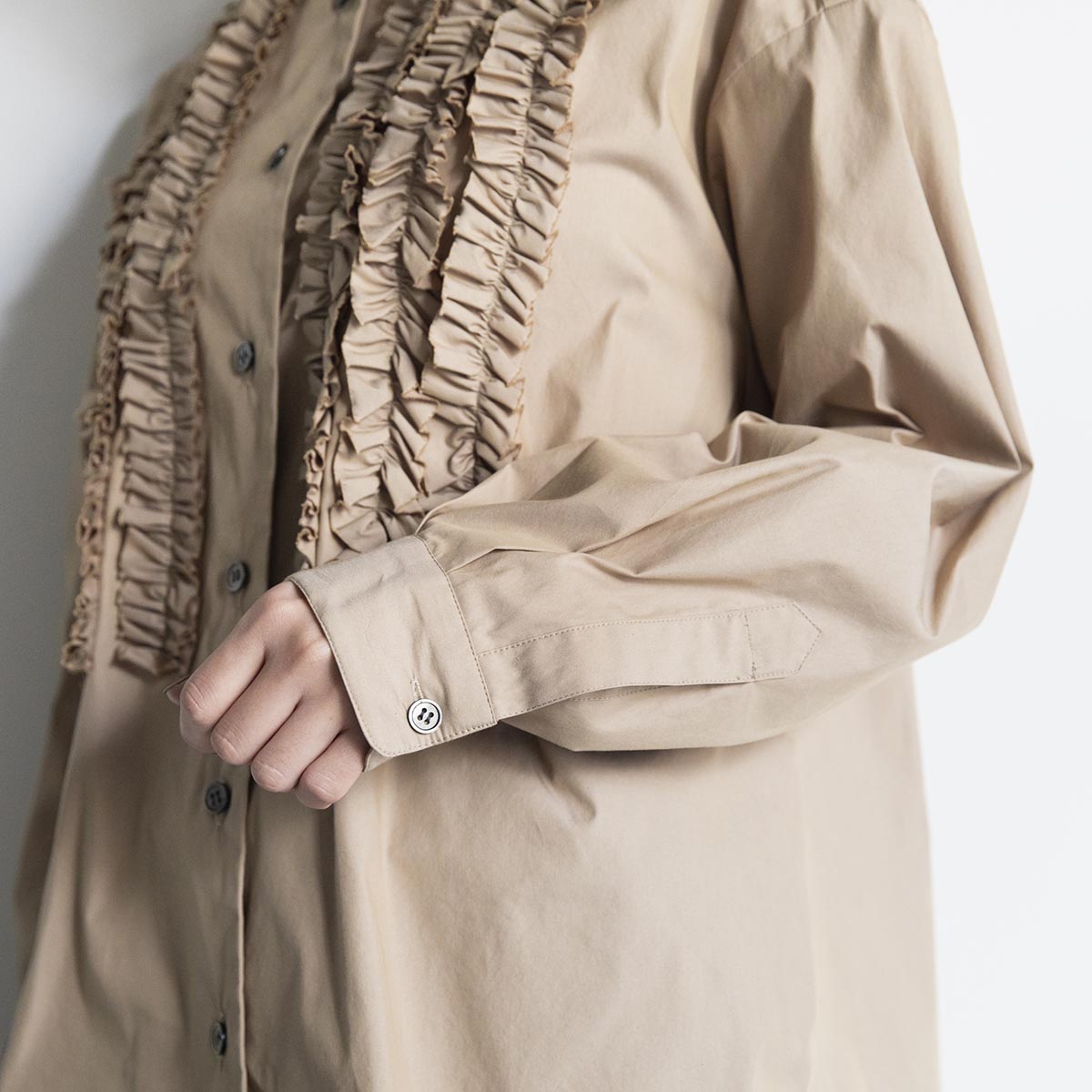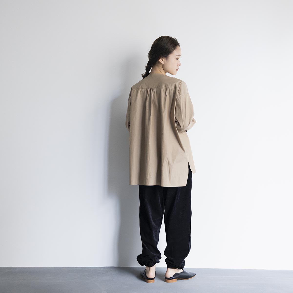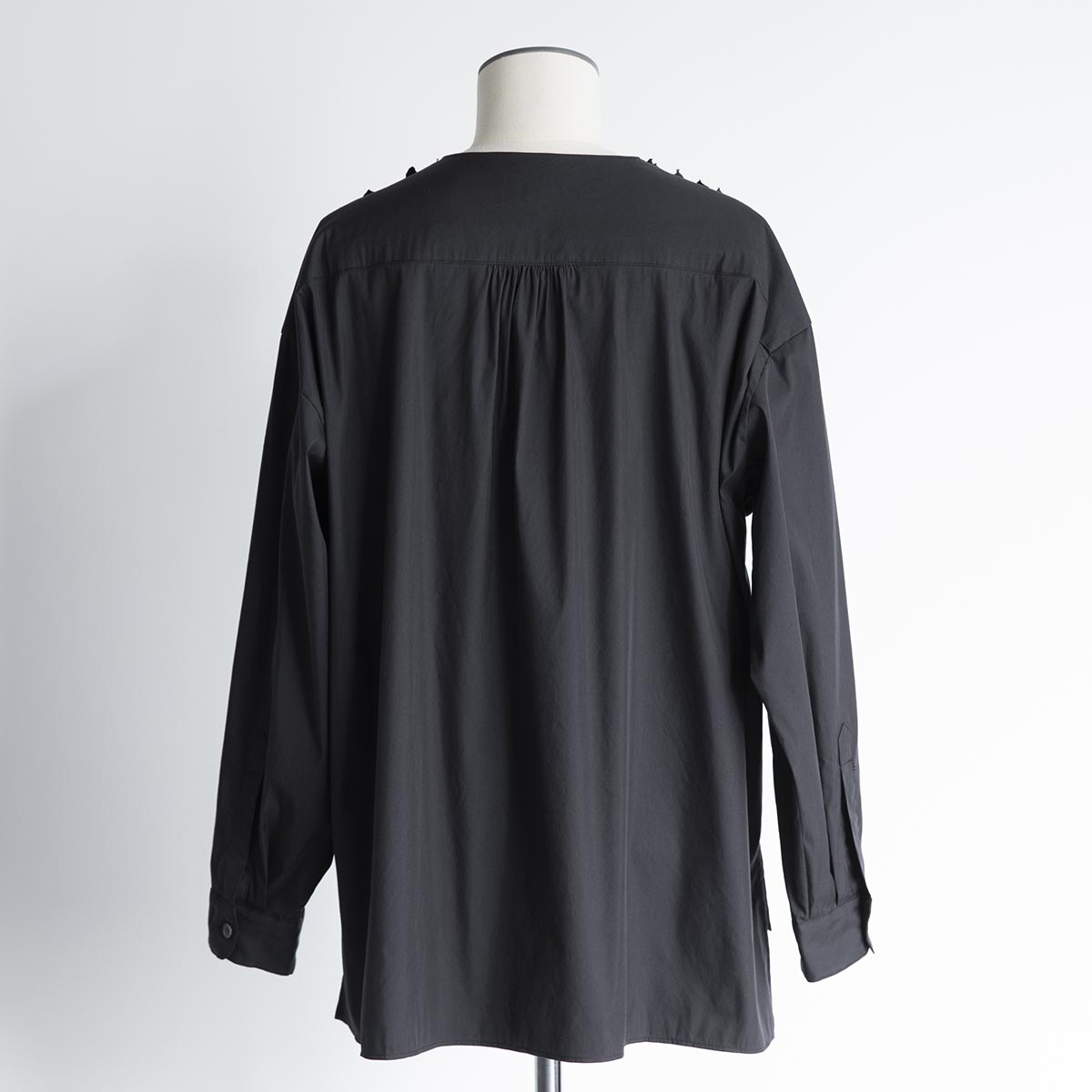 胸元のギャザーフリルがポイントのノーカラーシャツ。