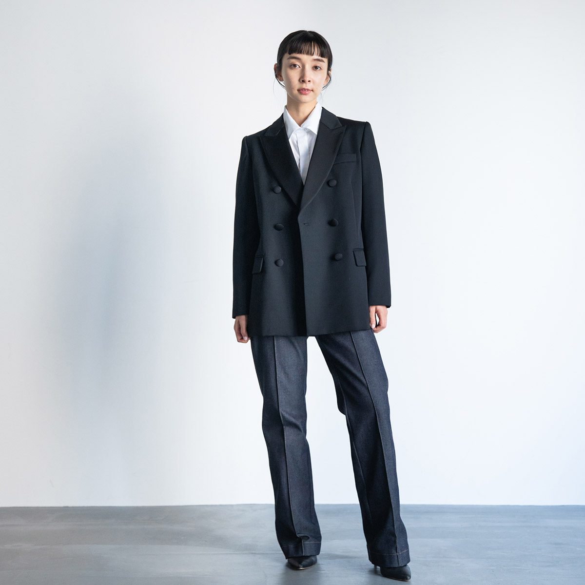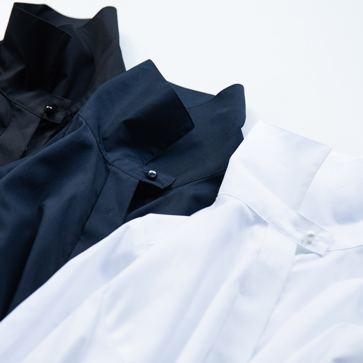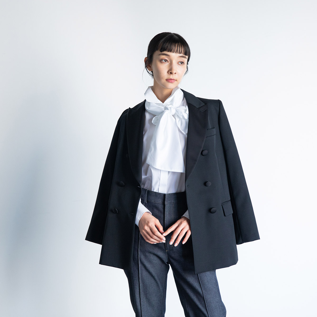 ボウをはずして衿を立てるとさりげなく見え隠れします。