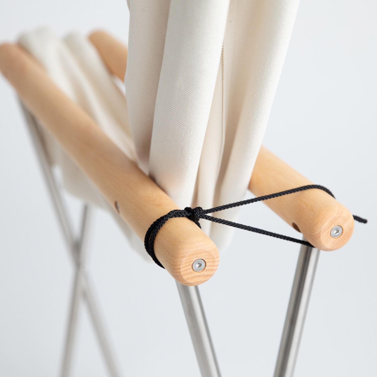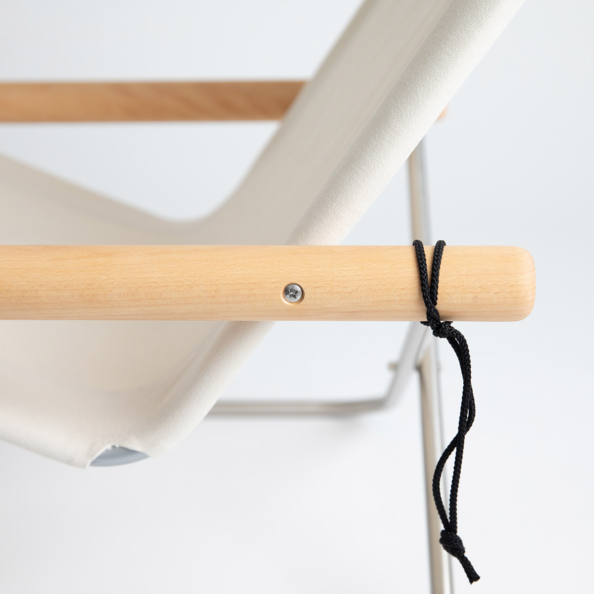 使わないときは紐で肘掛けを固定することでコンパクトに。