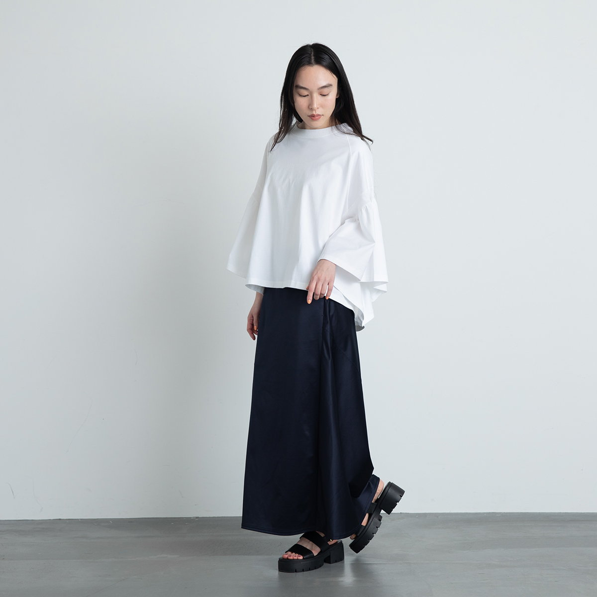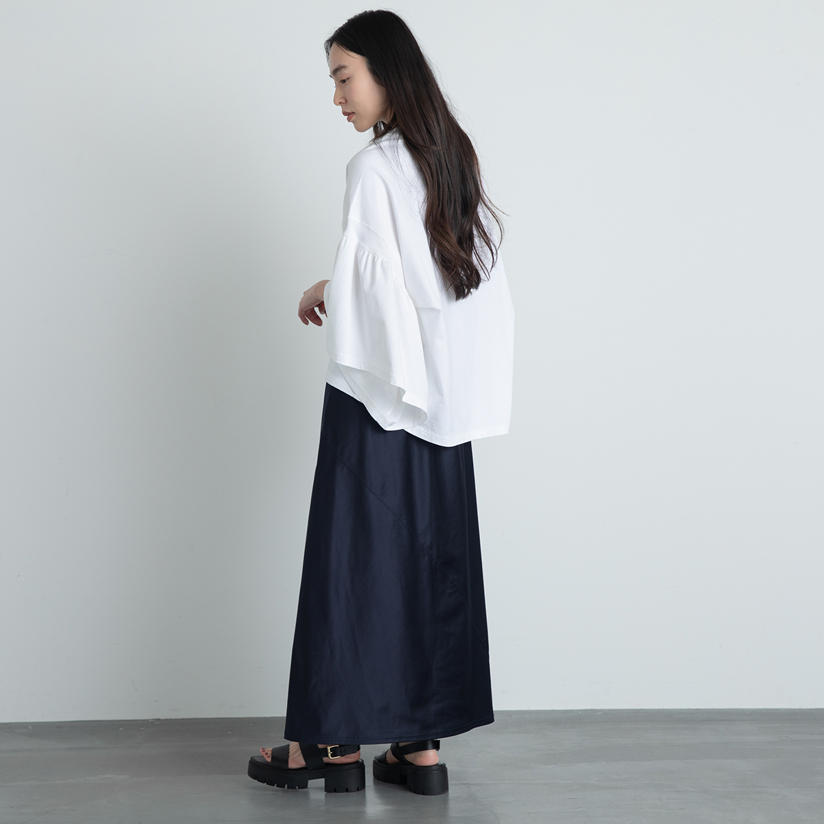 やや後ろ下がりのシルエットが