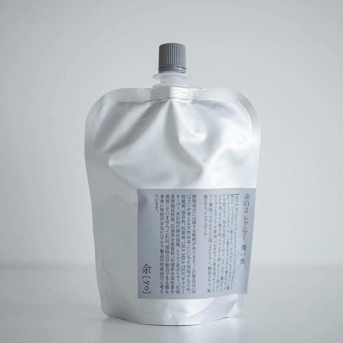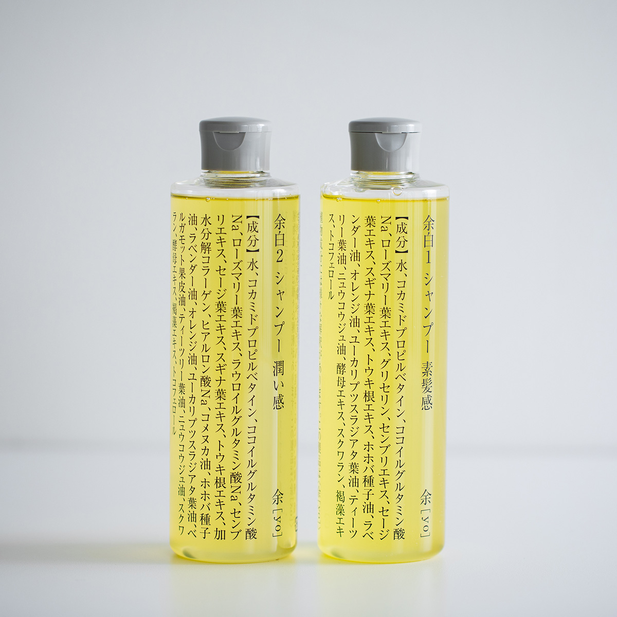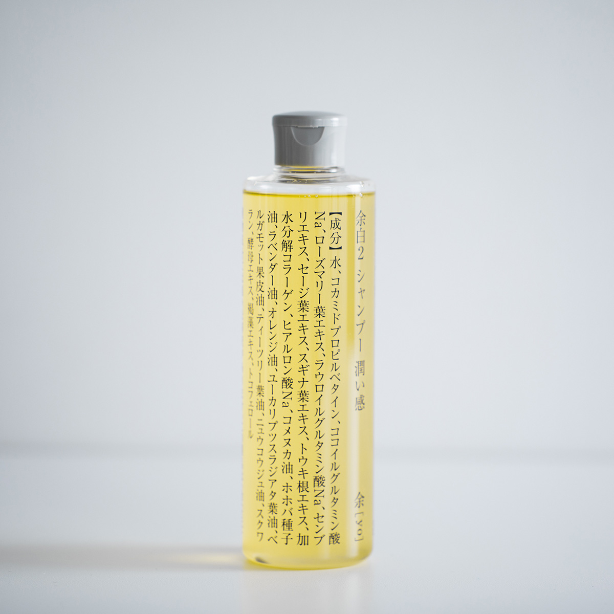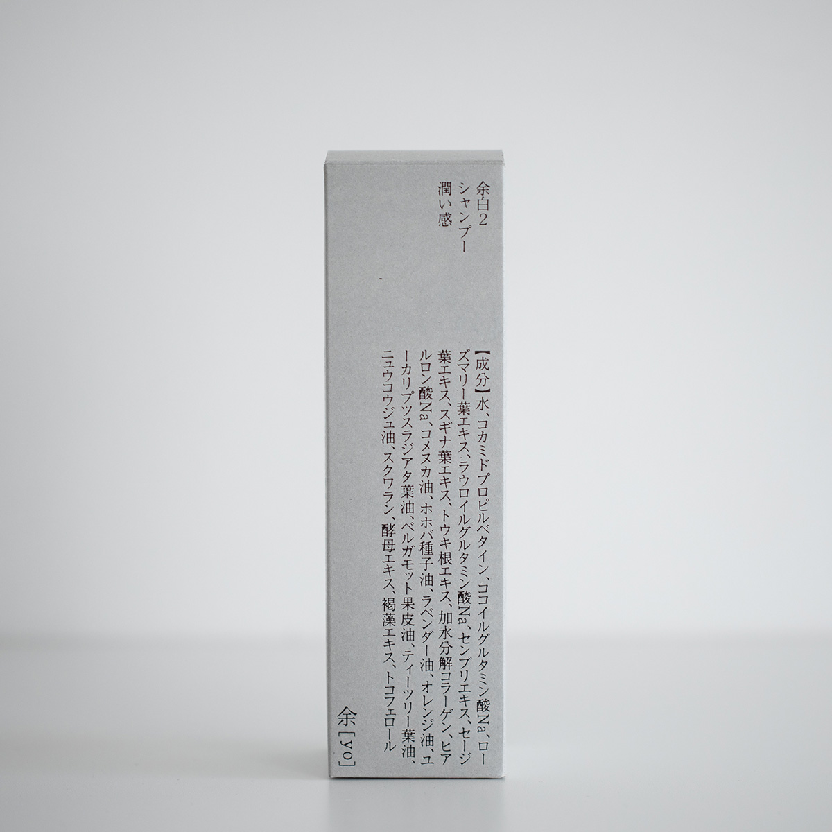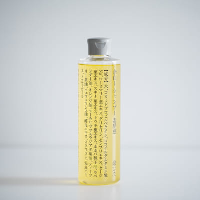 水、コカミドプロピルベタイン、ココイルグルタミン酸Na、ローズマリー葉エキス、ラウロイルグルタミン酸Na、センブリエキス、セージ葉エキス、スギナ葉エキス、トウキ根エキス、加水分解コラーゲン、ヒアルロン酸Na、コメヌカ油、ホホバ種子油、ラベンダー油、スイートオレンジ油、ユーカリ油、ベルガモット果皮油、ティーツリー葉油、ニュウコウジュ油、スクワラン、酵母エキス、褐藻エキス、トコフェロール