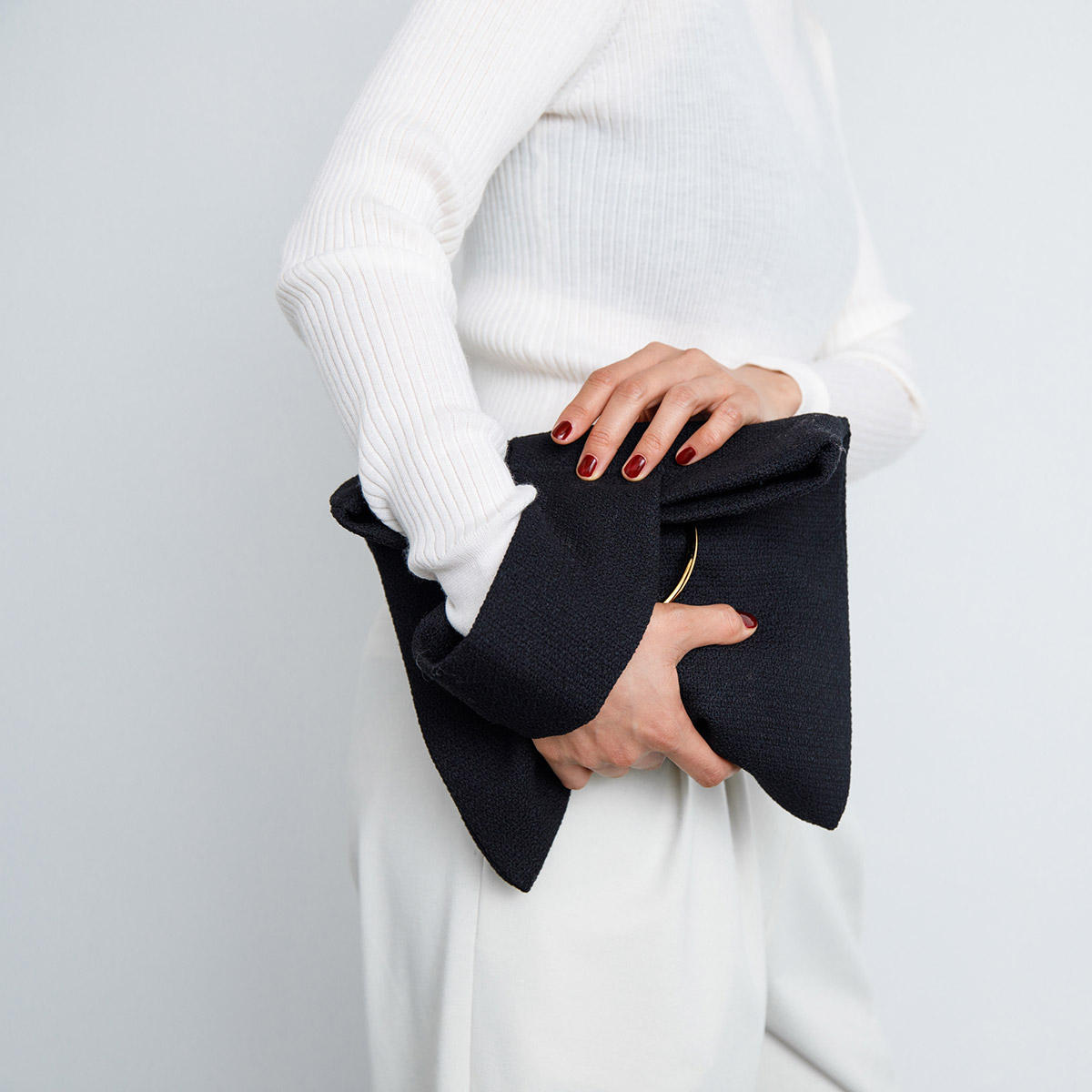 「ベーシックな黒にニュアンスのあるツィードを乗せて、
