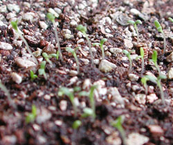 4月20日(金曜日)の観察日記。 シェフの高性能デジカメで接写! どうよ。このかわいらしいなでしこの芽は。 発芽約3日目になりました。 こんなちっこくても、太陽のほうに、 双葉をにゅっと向けるすがたが愛おしいのです。 (左上に太陽があると思いねえ。)