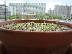 5月1日(火曜日)の観察日記。 なでしこちゃんごしのsuburban landscape さて、ゴールデンウイーク中のなでしこちゃんですが。 もぎ・木工用ボンドガールが、 美容院にいったり、プールにいったりして 家にあんまりいなくても、 実際、ボンド・ママが手入れをしてるので、 とても元気です。 1ミリくらい本葉がでてきたものも数本ありますぜ。