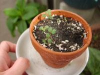 | ●おおやけの隠し玉(ミニバラ)。 全体図(左手入り)。 ちょっと大きさがわかりやすいように、 左手を入れてみました。 (本当は、いつも撮影してるベランダの柵が 洗濯物に占領されていたため、手持ちでござる。) ま、このように、ミニバラ、流石にミニ。でございますよ。 で、お約束どおり、今日は、芽をちゃんとアップで 撮影してきました。 本葉の片方が、何故か下を向いてますが。 ギザギザがなんとも愛らしいのでした。 *撫子の栽培に失敗したときに、まずいので、 |