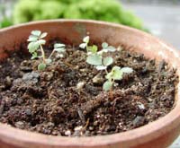 こっちも育ってるよ。 さて、こちらは、派手に本葉をばかばか出し始めてます。 なんとなく、葉っぱが赤みがかった縁取りになってて、 かなりカワイイのさ。 ものの本によれば、 アブラムシが結構付くらしいのでありますよ。 気を付けねば。 我が家では、先日も、もう明日にでも収穫! と思っていたバジルの葉っぱが、 尺取り虫に食い荒らされておりまして、 夏はいいんだけど、虫がでるんだよな、とうんざり。 昨日は「初蚊にさされ」でしたし。 みなさんは、もう蚊にさされましたか? (変な質問ですが。) これも「初物」の一種ですかね。 |