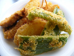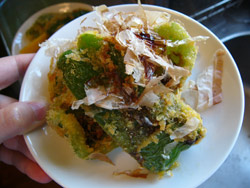 ピーマンを油と一緒に調理すると 相性がよくっておいしく食べられることは 料理好きの方ならご存じのことだと思うのですが 今回は、その中でも “パン粉をつけたフライ”をおすすめします。 素揚げや天ぷらなら、 こんなに肉厚なピーマンでなくても おいしくできるかもしれないのですが 衣をつけても負けない この肉厚なピーマンなら より一層ジューシーさと甘さが感じられるのです。 ![]() このボリューム感、1人1個でも 結構食べ甲斐がありますよ。 ピーマンフライ・かつお醤油がけのレシピ 1:ピーマンをお好みで4等分〜6等分にきる。 2:なかの白い部分を適当に取る。 (ただ、今回はフライの小麦粉がつきにくいので やや丁寧に取りましたが、残ってもいいです。) 3:小麦粉つける。 4:たまごつける 5:パン粉つける。 6:油で揚げる。 7:衣がほんのり茶色くなったら、あげる。 8:鰹節と醤油を少したらして、 熱いうちにどうぞ召し上がれ。 コツとしては、 長い時間あげないこと、 生で食べてもおいしいピーマンなので 少し時間が足りないかなというぐらいが ちょうどいいと思います。 ピーマンだけでなく、 野菜のおいしい季節が近づいてきましたので 野菜が主菜のフライ盛り合わせなんかもおすすめです。 ![]() 今が旬の沖縄ピーマン、6月いっぱいぐらいまで おいしいものが手にはいるということですが、 おいしいものを早めに食べて、味を知って、損をする、 なんてことはありません。 しかも、旬の野菜は、 おいしいことに加えて安いのです。 1年でもっともおいしいこの時期のピーマン、 生でかじれるピーマン、 どうぞ、この機会にお試しくださいね。