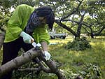 炎天下の畑で桃の実拾いやノコギリを持たせたり