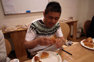 ナイフでパンを切って、