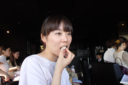 | あ、これはわたしです。 記者発表現場で「らくがん」を食べています。 チズさんおすすめの京都の「らくがん」です。 おいしかった。 |