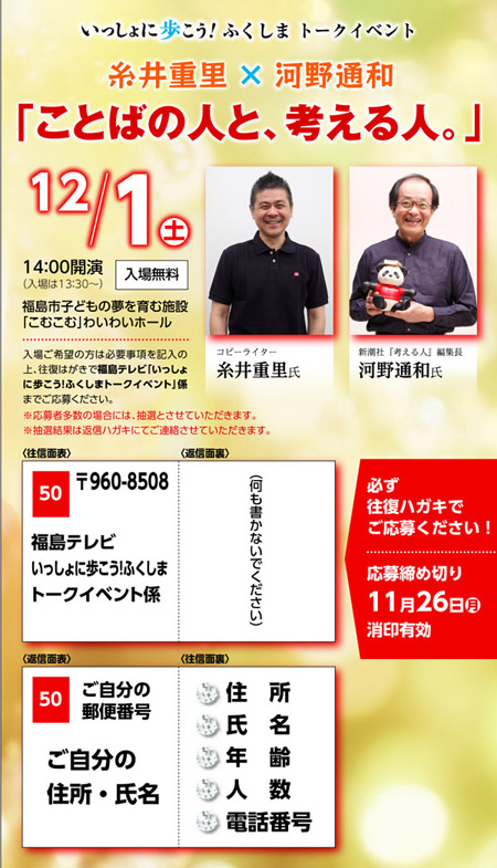 いっしょに歩こう!ふくしま トークイベント ※トークイベントは入場無料ですが ※ご応募のしめきりは、11月26日(月)消印有効です。