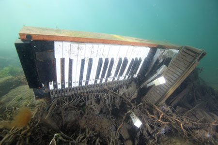 ![]() ▲沈んでいた壊れたピアノ。大船渡湾。(2011年4月5日) 『ダンゴウオ 海の底から見た震災と再生』より。 |