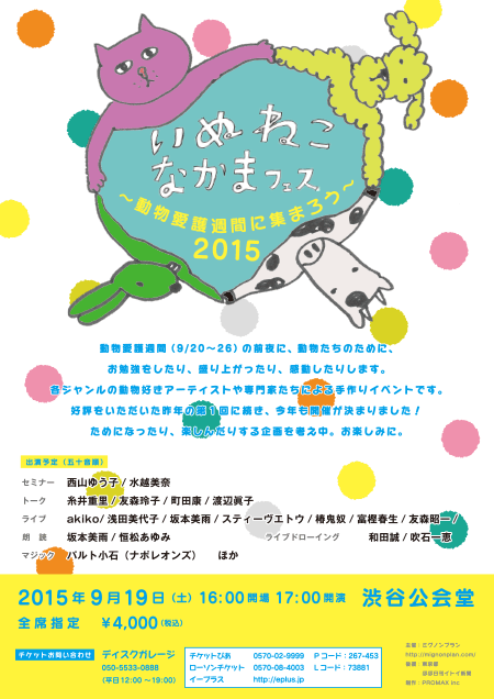 | 「いぬねこなかまフェス」のチケットは まだいっぱいあるニョだよ。 9月の「シルバーウィーク」の 最初の土曜日だから、これを機会に 東京に遊びに来てもいいニャ! どこに行けば情報がわかるニョか。 |