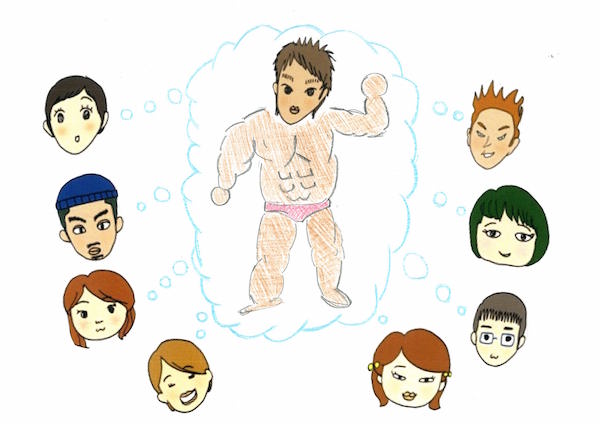 | ウワサのポイント(3) デザイナーたちが、 「菊地さんはパーマをかけていて、 ヒゲも整えている」 という話をしているところに、 「日焼けサロンに行っている」 という話がプラスされた。 そのため、 「菊地さんは色黒になることにより、 強そうに見られたがっているのでは」 という憶測が生まれ、飲み会が盛り上がった。 |