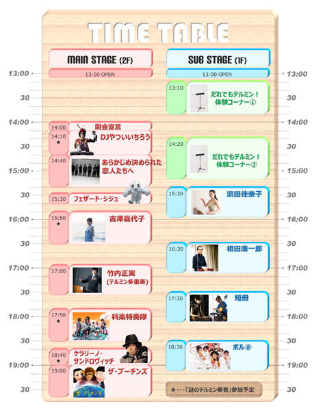 | 全日本テルミンフェス 9月19日(月祝) 13:00開場 14:00開演 終演19:30予定 ※タイムテーブルはこちら 会場:渋谷「WOMB」(ウーム) 東京都渋谷区円山町2-16 チケット:前売券4,000円 :当日券4,500円 1ドリンク代500円が別途かかります。 こちらで販売中 ※チケットの販売状況により、 当日券の取り扱いが無くなる場合があります。 |